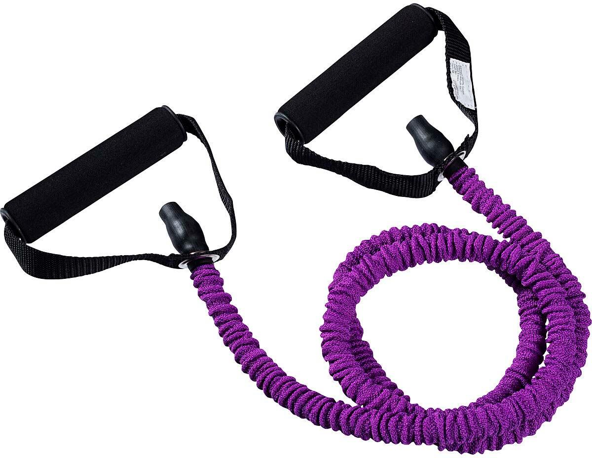 Schlingentrainer zur Kräftigung der Schulter- und Oberarmmuskulatur; mit schweißabsorbierenden Handgriffen aus EVA-Schaum; geraffter Gewebeüberzug schützt das Gummiseil; verschiedene Trainingsstärken: rot (leicht), lila (mittel), blau (stark).