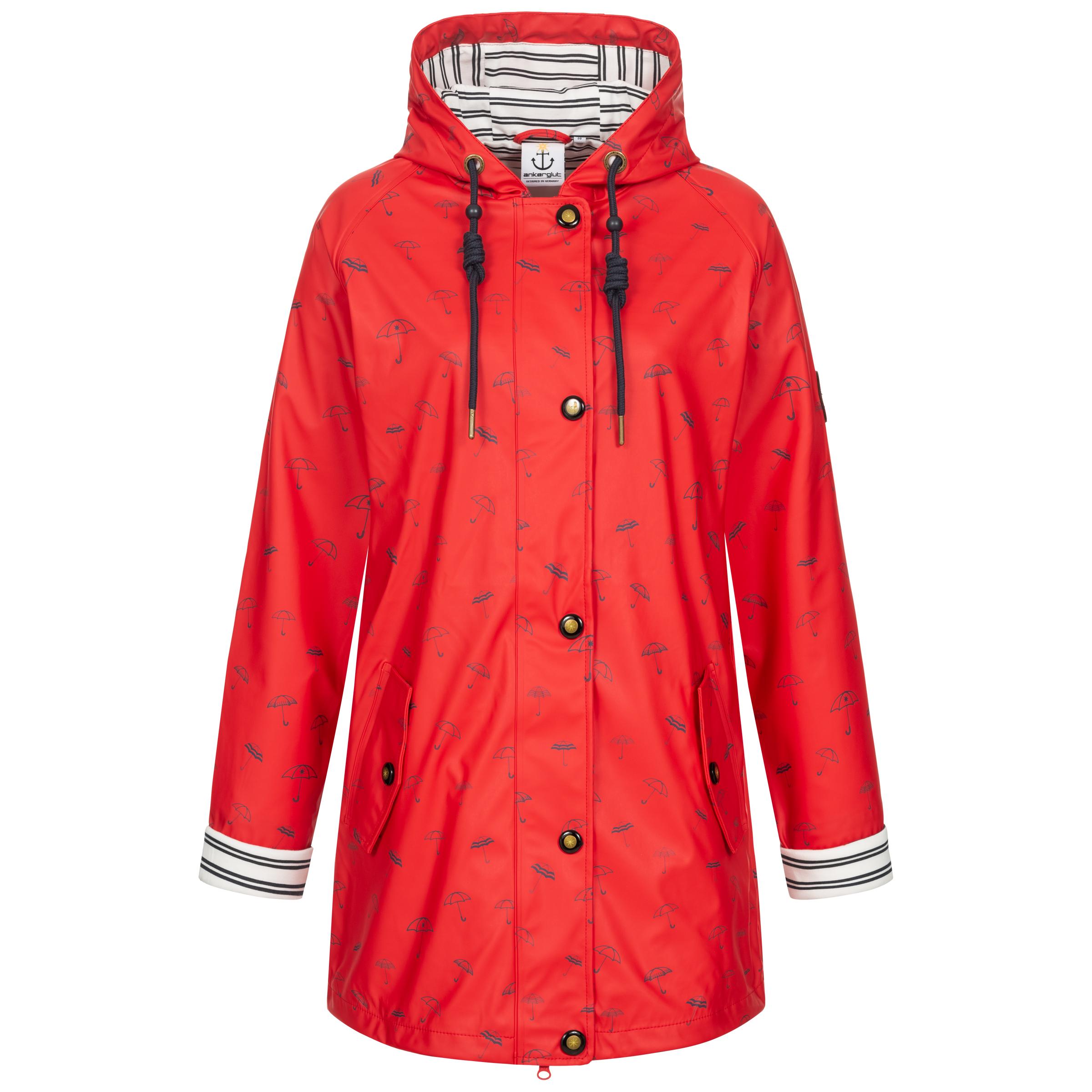 Wolkenvorhang auf für unsere Damen Regenjacke ANKERGLUTBUCHT! Wenn Petrus mal wieder die große Regenvorstellung startet, dann bist du damit bestens gerüstet. Die maritime Regenjacke im klassischen Stil eines Friesennerzes sorgt dank ihres hübschen Regenschirm-Musters auch an grauen Tagen für gute Laune. Das wasserdichte Außenmaterial ist an den Nähten verschweißt und bietet verlässlichen Regenschutz. Die Innenseite ist mit einem herrlich soften Jerseyfutter im Streifendesign ausgestattet und sorgt für ein angenehmes Tragegefühl. Dank Taftfutter in den Ärmeln gleitest du ganz einfach in die Jacke, ohne dass Ärmel von Bluse oder Pullover nach oben rutschen. Der untere Teil des Ärmels ist ebenfalls mit dem Streifenfutter versehen, wodurch du diesen umschlagen kannst. Damit erhält deine neue Lieblingsjacke einen ganz besonderen Akzent, den du garantiert lieben wirst. Die Kapuze ist mit einer farblich abgestimmten Kordel versehen. Der Reißverschluss kann in beide Richtungen geöffnet werden. Zusätzlich wird er von einer Windschutzblende geschützt. Die beiden äußeren Eingrifftaschen können mit Druckknopf verschlossen werden. Eine innenliegende Brusttasche bietet ausreichend Platz für ein Smartphone. Die Weite der figurumspielenden Jacke kann mit einem elastischen Kordelzug am unteren Saum reguliert werden. Liebevolle Labeldetails wie Ärmelpatch, außergewöhnliche Druckknöpfe und kleine versteckte Botschaften warten darauf, von dir entdeckt zu werden.