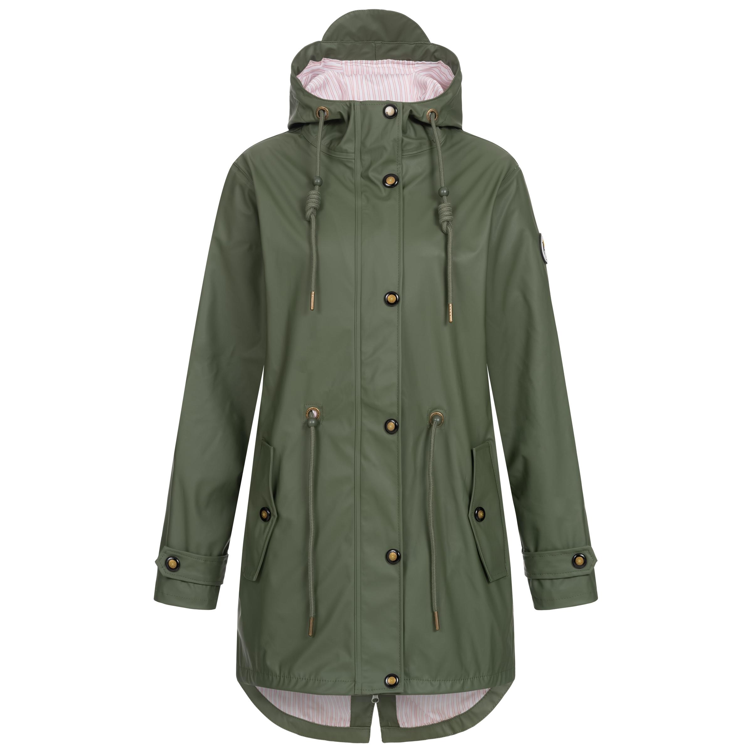 Gedeiht am besten in Freilandhaltung: Unser Damen Regenmantel ANKERGLUTLIEBE mag am liebsten draußen von dir ausgeführt werden. Je trüber, grauer und stürmischer, umso besser! Der Regenmantel im klassischen Stil eines Friesennerzes trumpft mit hübschen Details auf. Das wasser- und winddichte Obermaterial lässt dich garantiert nicht im Regen stehen. Zudem sorgen verschweißte Nähte für zuverlässigen Schutz. Die Innenseite ist mit einem Webfutter im Streifendesign ausgestattet und sorgt für ein angenehmes und komfortables Tragegefühl. Dank Taftfutter in den Ärmeln gleitest du ganz einfach in die Jacke, ohne dass Ärmel von Bluse oder Pullover nach oben rutschen. Die Weite des Ärmels kann mit einem Riegel verstellt werden. Auch die Taillenweite des Regenparkas ist regulierbar. Dank eines praktischen 2-Wege-Reißverschlusses macht der Regenmantel jede Bewegung uneingeschränkt mit. Zusätzlich wird dieser von einer Windschutzblende geschützt. Die beiden äußeren Eingrifftaschen können mit Druckknopf verschlossen werden. Zwei innenliegende Brusttaschen bieten ausreichend Platz für Smartphone & Co. Liebevolle Labeldetails wie Ärmelpatch, außergewöhnliche Druckknöpfe und kleine versteckte Botschaften warten darauf, von dir entdeckt zu werden.