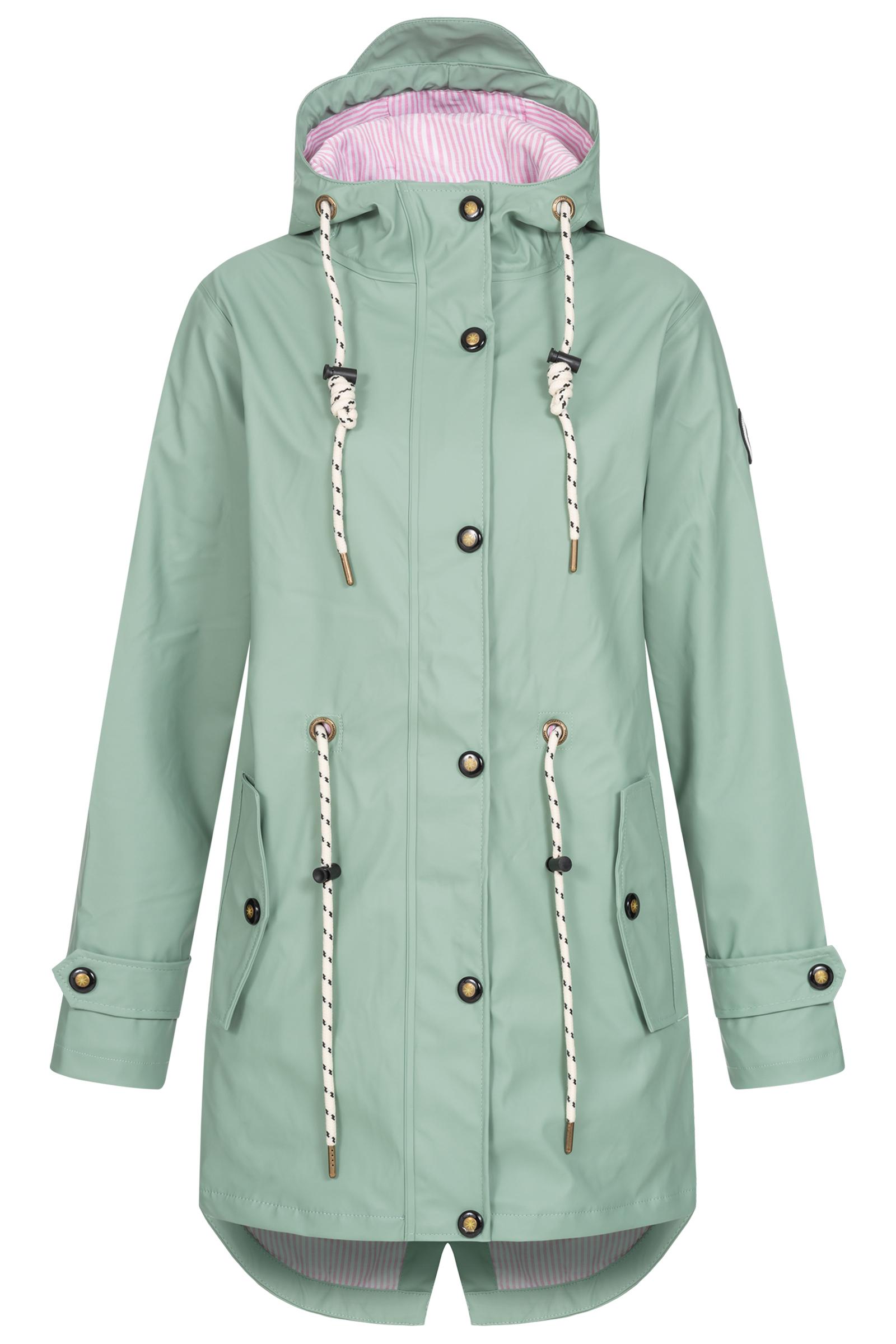 Gedeiht am besten in Freilandhaltung: Unser Damen Regenmantel ANKERGLUTLIEBE mag am liebsten draußen von dir ausgeführt werden. Je trüber, grauer und stürmischer, umso besser! Der Regenmantel im klassischen Stil eines Friesennerzes trumpft mit hübschen Details auf. Das wasser- und winddichte Obermaterial lässt dich garantiert nicht im Regen stehen. Zudem sorgen verschweißte Nähte für zuverlässigen Schutz. Die Innenseite ist mit einem Webfutter im Streifendesign ausgestattet und sorgt für ein angenehmes und komfortables Tragegefühl. Dank Taftfutter in den Ärmeln gleitest du ganz einfach in die Jacke, ohne dass Ärmel von Bluse oder Pullover nach oben rutschen. Die Weite des Ärmels kann mit einem Riegel verstellt werden. Auch die Taillenweite des Regenparkas ist regulierbar. Dank eines praktischen 2-Wege-Reißverschlusses macht der Regenmantel jede Bewegung uneingeschränkt mit. Zusätzlich wird dieser von einer Windschutzblende geschützt. Die beiden äußeren Eingrifftaschen können mit Druckknopf verschlossen werden. Zwei innenliegende Brusttaschen bieten ausreichend Platz für Smartphone & Co. Liebevolle Labeldetails wie Ärmelpatch, außergewöhnliche Druckknöpfe und kleine versteckte Botschaften warten darauf, von dir entdeckt zu werden.