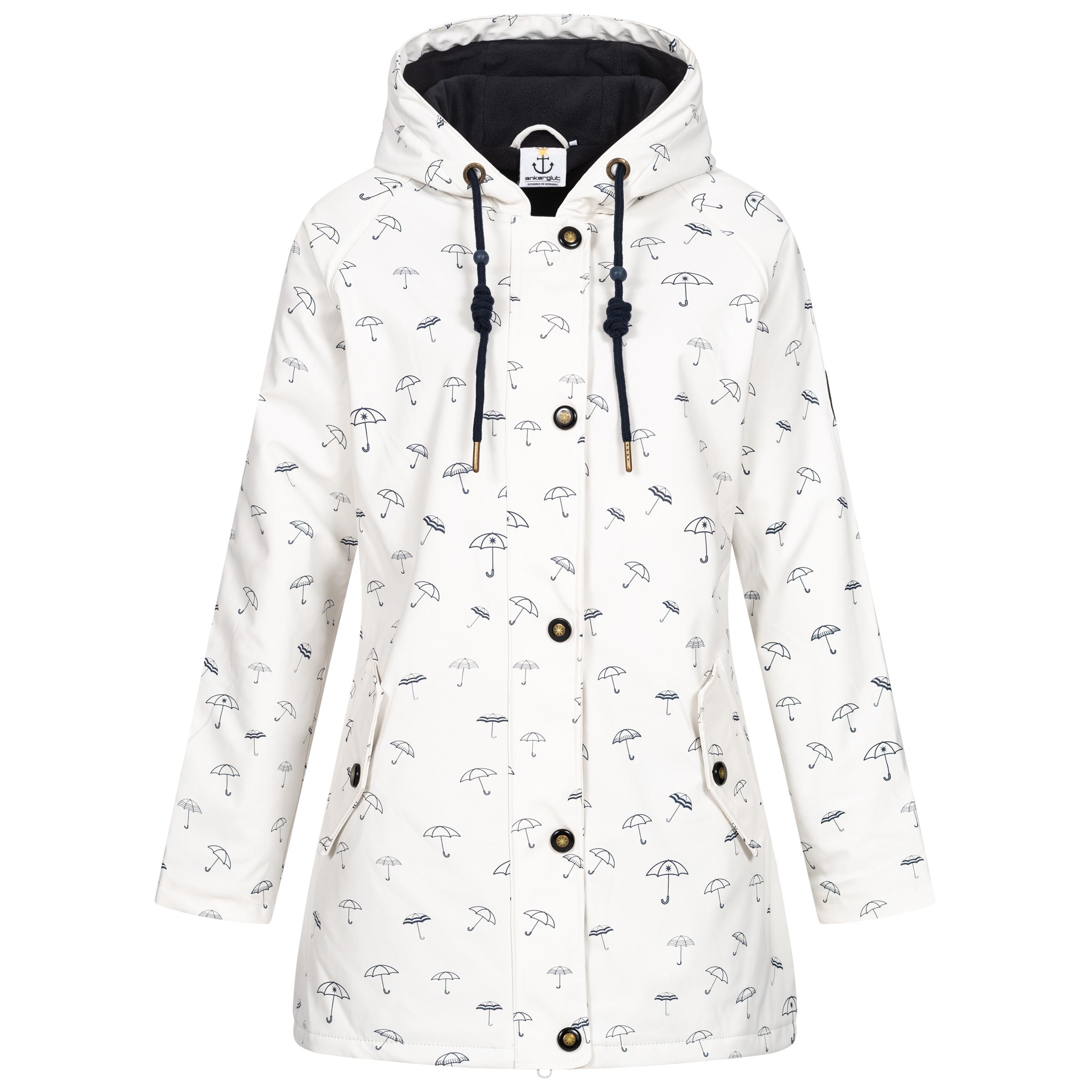 Wolkenvorhang auf für unsere Damen Regenjacke ANKERGLUTMEER! Wenn Petrus mal wieder die große Regenvorstellung startet, dann bist du damit bestens gerüstet. Die maritime Regenjacke im klassischen Stil eines Friesennerzes sorgt dank ihres hübschen Regenschirmprints auch an grauen Tagen für gute Laune. Das wasserdichte Außenmaterial ist an den Nähten verschweißt und bietet verlässlichen Regenschutz. Die Innenseite ist mit einem herrlich soften Fleecefutter ausgestattet und sorgt für ein angenehmes Tragegefühl. Dank Taftfutter in den Ärmeln gleitest du ganz einfach in die Jacke, ohne dass Ärmel von Bluse oder Pullover nach oben rutschen. Die Kapuze ist mit einer farblich abgestimmten Kordel versehen. Der Reißverschluss kann in beide Richtungen geöffnet werden. Zusätzlich wird er von einer Windschutzblende geschützt. Die beiden äußeren Eingrifftaschen können mit Druckknopf verschlossen werden. Eine innenliegende Brusttasche bietet ausreichend Platz für ein Smartphone. Die Weite der figurumspielenden Jacke kann mit einem elastischen Kordelzug am unteren Saum reguliert werden. Liebevolle Labeldetails wie Ärmelpatch, außergewöhnliche Druckknöpfe und kleine versteckte Botschaften warten darauf, von dir entdeckt zu werden.