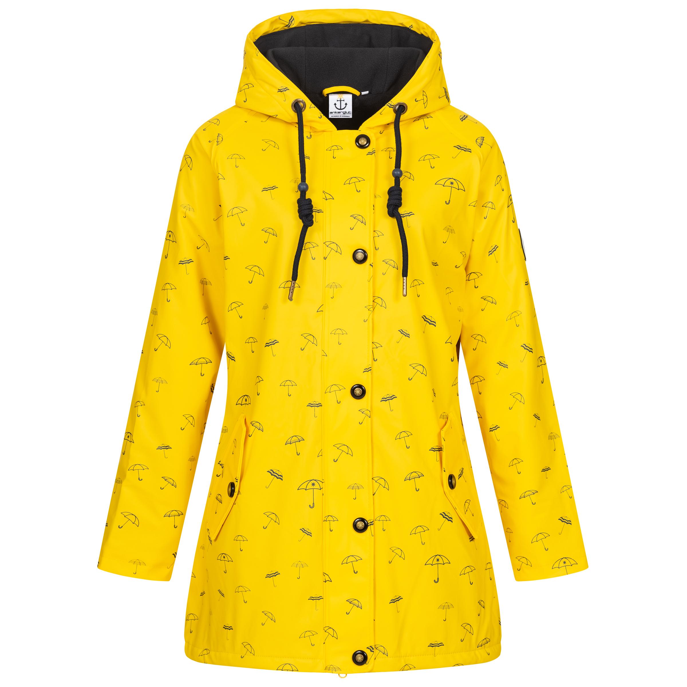 Wolkenvorhang auf für unsere Damen Regenjacke ANKERGLUTMEER! Wenn Petrus mal wieder die große Regenvorstellung startet, dann bist du damit bestens gerüstet. Die maritime Regenjacke im klassischen Stil eines Friesennerzes sorgt dank ihres hübschen Regenschirmprints auch an grauen Tagen für gute Laune. Das wasserdichte Außenmaterial ist an den Nähten verschweißt und bietet verlässlichen Regenschutz. Die Innenseite ist mit einem herrlich soften Fleecefutter ausgestattet und sorgt für ein angenehmes Tragegefühl. Dank Taftfutter in den Ärmeln gleitest du ganz einfach in die Jacke, ohne dass Ärmel von Bluse oder Pullover nach oben rutschen. Die Kapuze ist mit einer farblich abgestimmten Kordel versehen. Der Reißverschluss kann in beide Richtungen geöffnet werden. Zusätzlich wird er von einer Windschutzblende geschützt. Die beiden äußeren Eingrifftaschen können mit Druckknopf verschlossen werden. Eine innenliegende Brusttasche bietet ausreichend Platz für ein Smartphone. Die Weite der figurumspielenden Jacke kann mit einem elastischen Kordelzug am unteren Saum reguliert werden. Liebevolle Labeldetails wie Ärmelpatch, außergewöhnliche Druckknöpfe und kleine versteckte Botschaften warten darauf, von dir entdeckt zu werden.