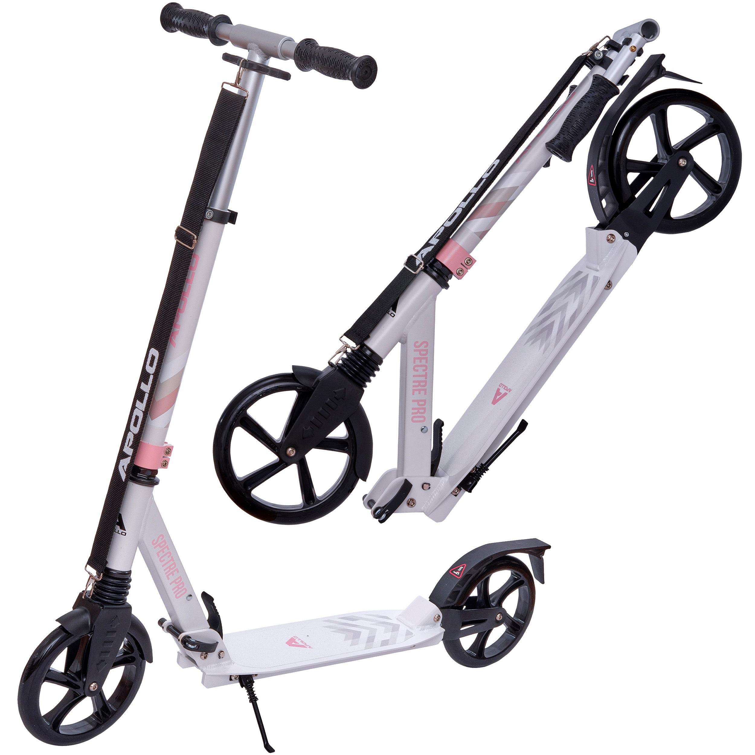 Alternative zu Bahn, Fahrrad oder Auto gesucht? Dann ist der City Scooter Spectre Pro »Galaxy« von Apollo einen Blick wert! Der tolle Roller bietet Fahrspaß XXL, denn mit seinen extra großen Reifen macht das Fahren gleich doppelt Spaß. Der XXL Wheel Scooter lässt sich spielend einfach zusammenklappen und mit dem praktischen Tragegurt lässig über die Schulter hängen. So kann spielend einfach zwischen rasanter Fahrt durch die City mit dem Scooter und öffentlichen Verkehrsmitteln gewechselt werden. Durch die rutschfeste Trittfläche und die ergonomisch geformten Handstücke wird die Fahrt nicht nur schnell, sondern auch sicher und bequem. Der City Scooter Spectre Pro »Galaxy« von Apollo ist ideal für schnelle Wege in der Stadt, aber auch für coole Stunts und Tricks geeignet. • Höhe Lenker: verstellbar von ca. 90-105 cm • Maße Deck B/T: ca. 45/13 cm • 2 Bolt Klemmen • XXL High Rebound Rollen: Ø 20 cm PU Wheels • Kugellager: ABEC9 • Mit praktischem Tragegurt • Extra großes Trittbrett mit rutschfestem Griptape • Gepolsterte Handgriffe • Hinterradreibungsbremse • Fußständer zum Abstellen • 1-Klick System zum Zusammenklappen mit Schnellspanner • Geeignet für Personen mit einer Körpergröße von 120-190 cm • Max. Tragkraft 100 kg
