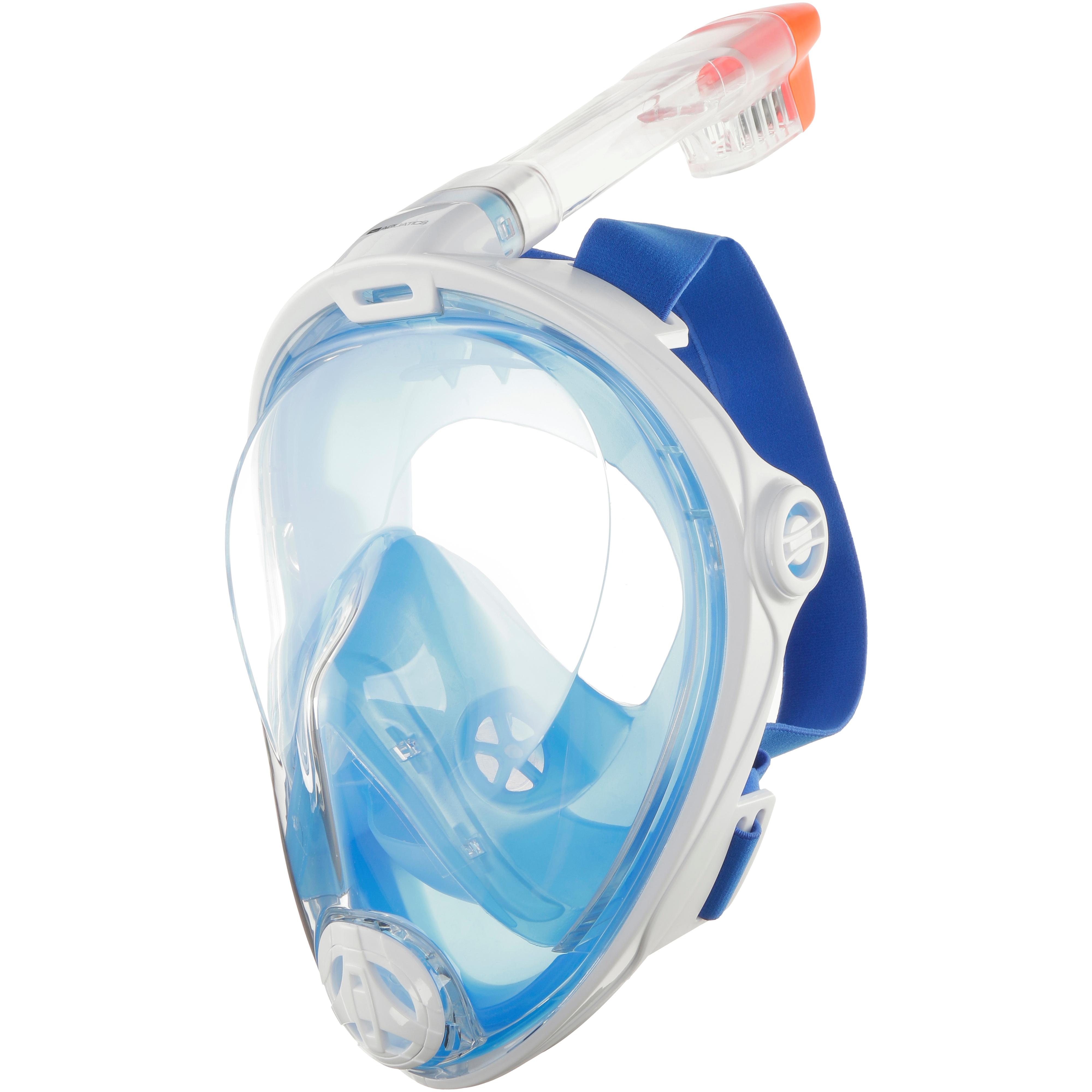 AQUASPHERE FULL FACE. Größenverstellbare Schnorchelmaske aus antiallergischem Silikon; abnehmbarer Schnorchel mit Dry-Top Funktion; Polycarbonat-Scheibe mit flachen Profil und 180° Blickfeld; Ausblasventil für einfaches Entleeren des Schnorchels.
