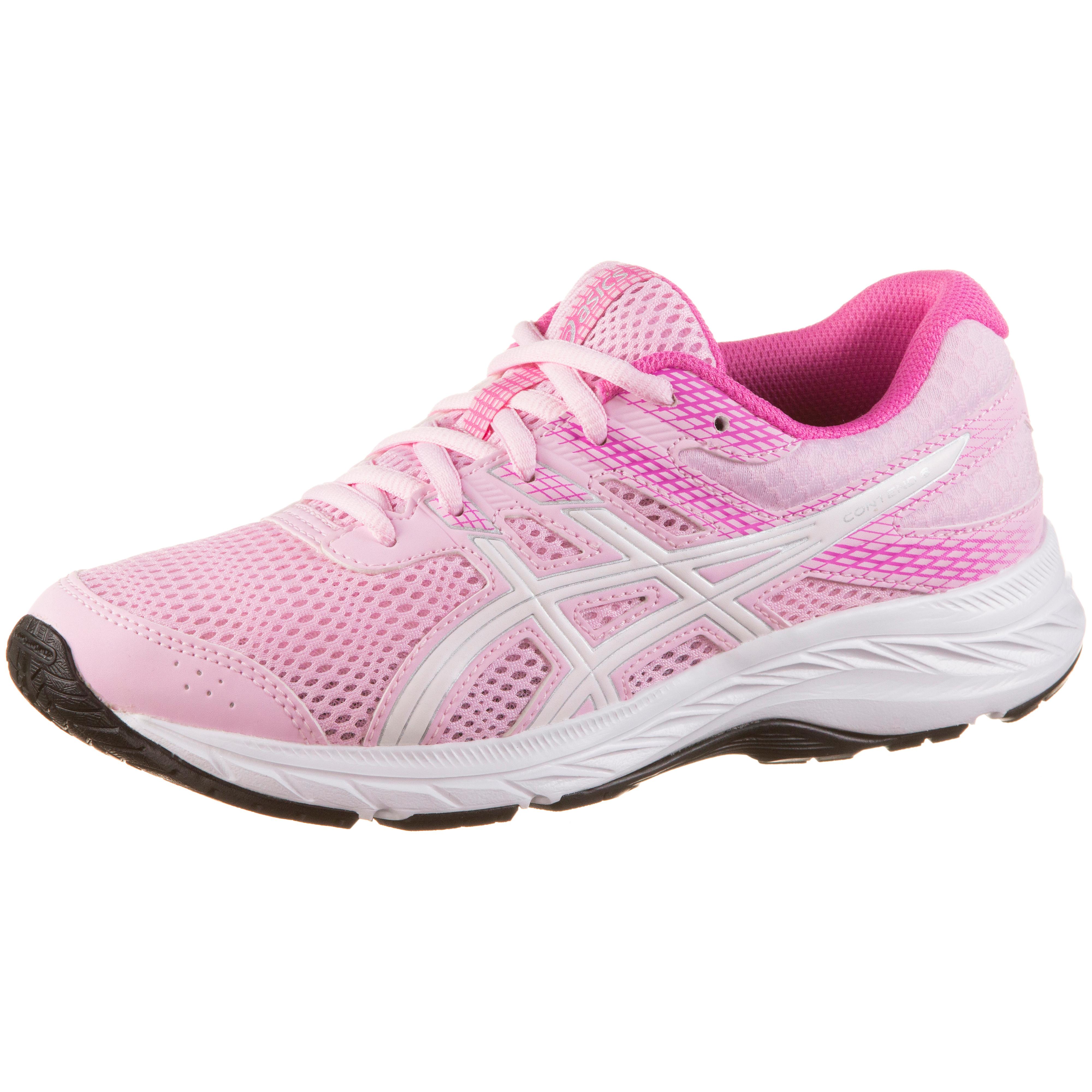 ASICS CONTEND 6 GS. Komfortable Laufschuhe für Einsteiger; Obermaterial aus atmungsaktivem Mesh; klassische Schnürung; gepolsterter Schaft; Textilfutter; interne Fersenkappe; EVA-Mittelsohle; robuste, geformte Außensohle aus Gummi.