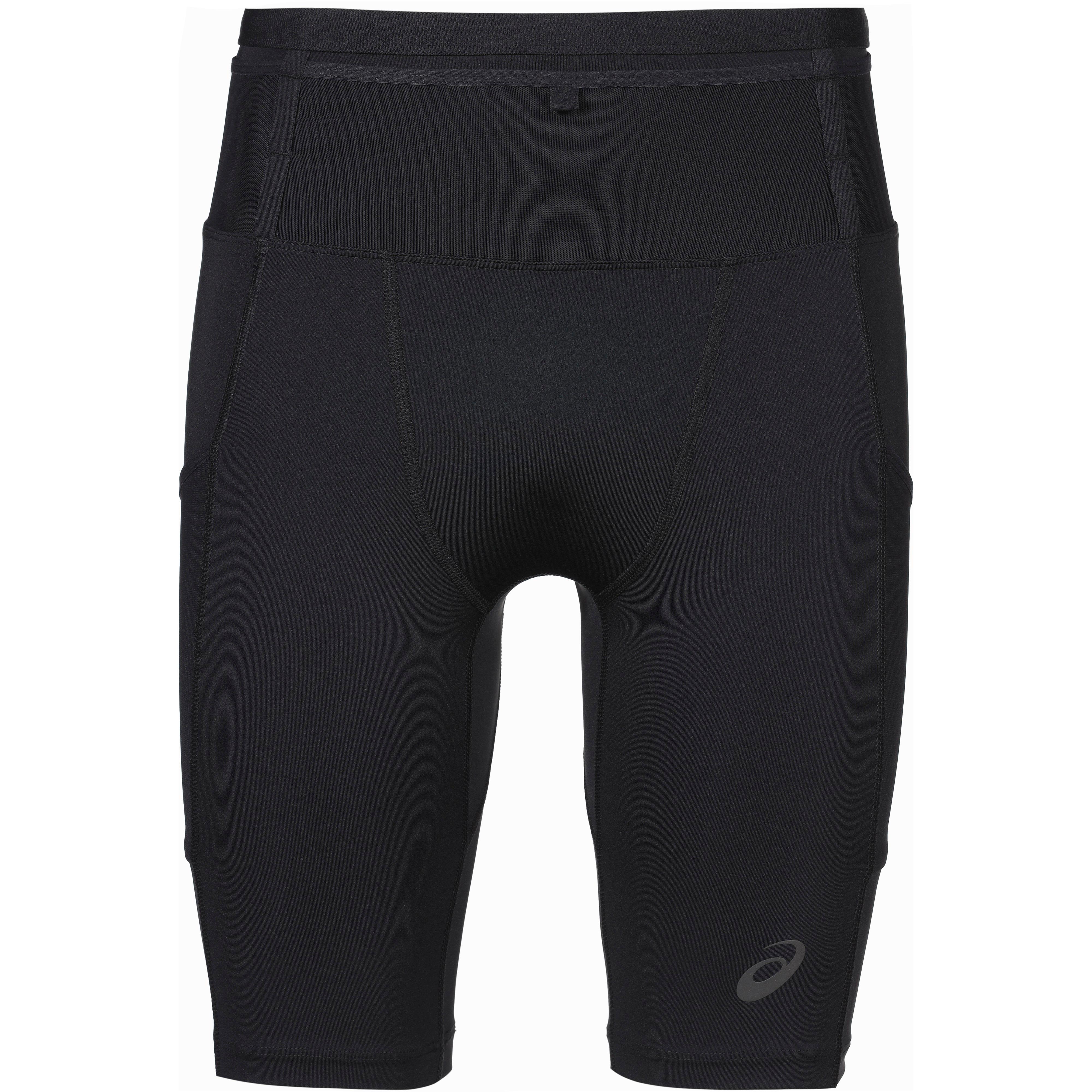 Kurze Lauftights aus Stretchmaterial; schnelltrocknend und feuchtigkeitsregulierend; mittelhoher Gummibund mit Kordelzug auf der Innenseite; Einstecktaschen aus Mesh am Bund und an den Oberschenkeln; Schlaufen auf der Rückseite, als Halterung für z.B. Stöcke oder eine Jacke; reflektierende Details; Seitenlänge: ca. 47 cm (Größe M); Material I 78% Polyester (recycelt), 22% Elastan; Material II 84% Polyester, 16% Elastan.