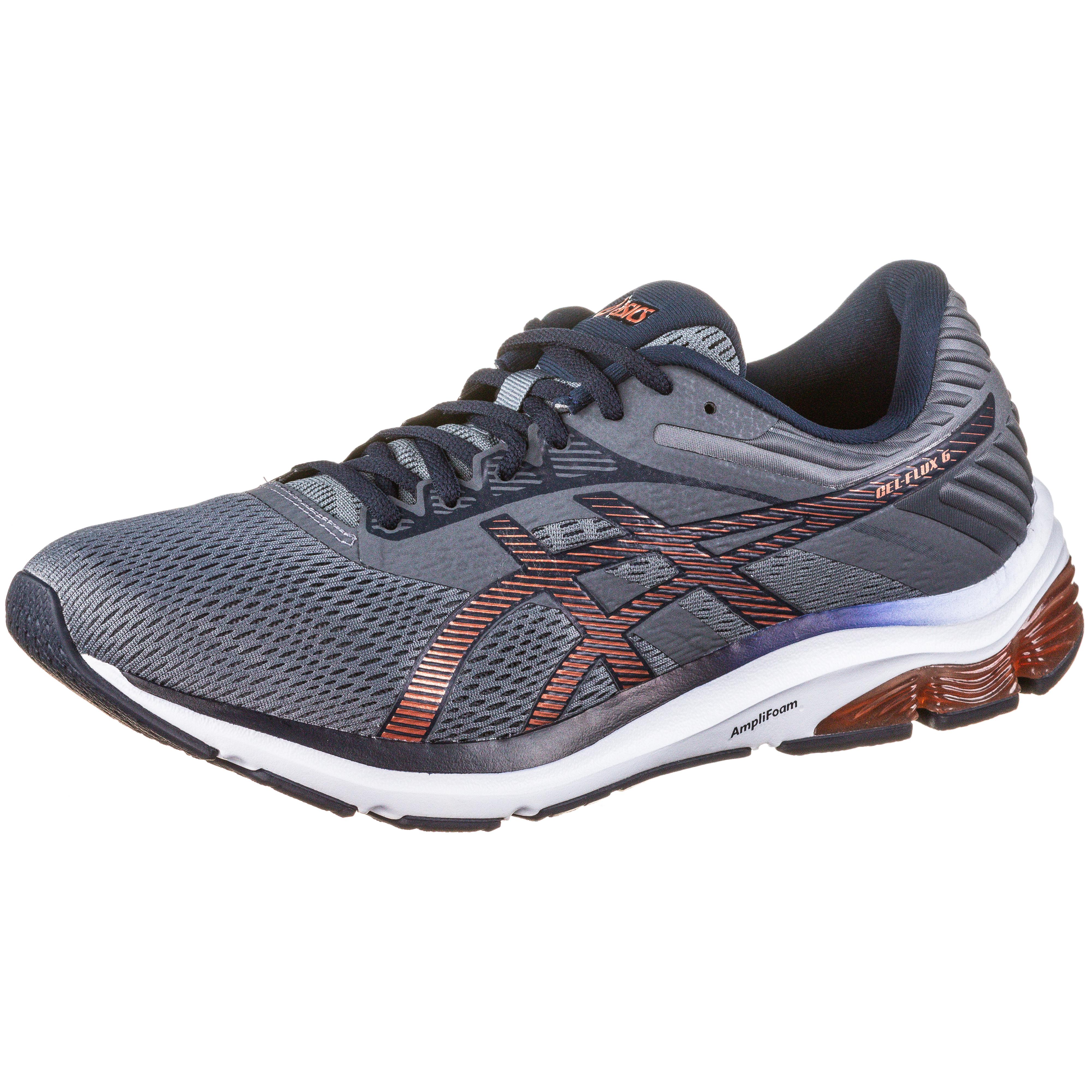 ASICS GEL FLUX 6. Leichte Laufschuhe aus nahezu nahtlosem und atmungsaktivem Mesh; stabilisierende Overlays; klassische Schnürung; schützende Fersenkappe; gepolsterter Fersenbereich; dämpfende AMPLIFOAM™- Mittelsohle mit zusätzlich dämpfender GEL™-Technologie im Rückfußbereich; herausnehmbare Einlegesohle: Gewicht: ca. 337 g (Gr. 43,5/ einzeln); abriebfeste Außensohle mit Guidance Line™ unterstützt natürliche, effiziente Laufbewegungen.