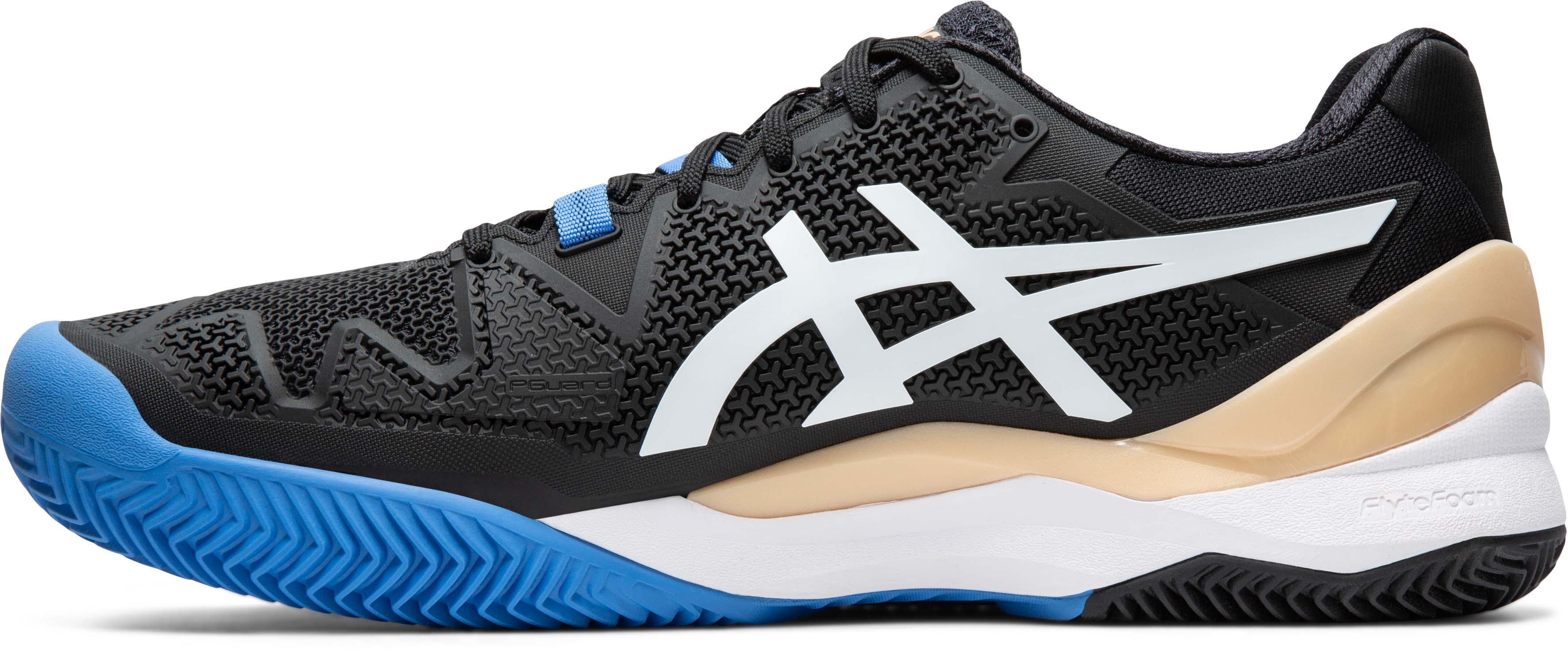 ASICS GEL-RESOLUTION 8 CLAY. Tennisschuhe mit PGUARD™-Zehenschutz; Unterstütztendes FLEXION FIT™-Obermaterial mit DYNAWALL™-Technologie, für zusätzlichen Halt im Mittelfußbereich; dämpfende GEL™-Technologie im Rück- und Vorfußbereich; herausnehmbare Einlegeplatten; gepolsterter Einstieg; Obermaterial aus Textil und Synthetik; Innensohle aus Textil; robuste, nicht abfärbende AHAR™-Außensohle.