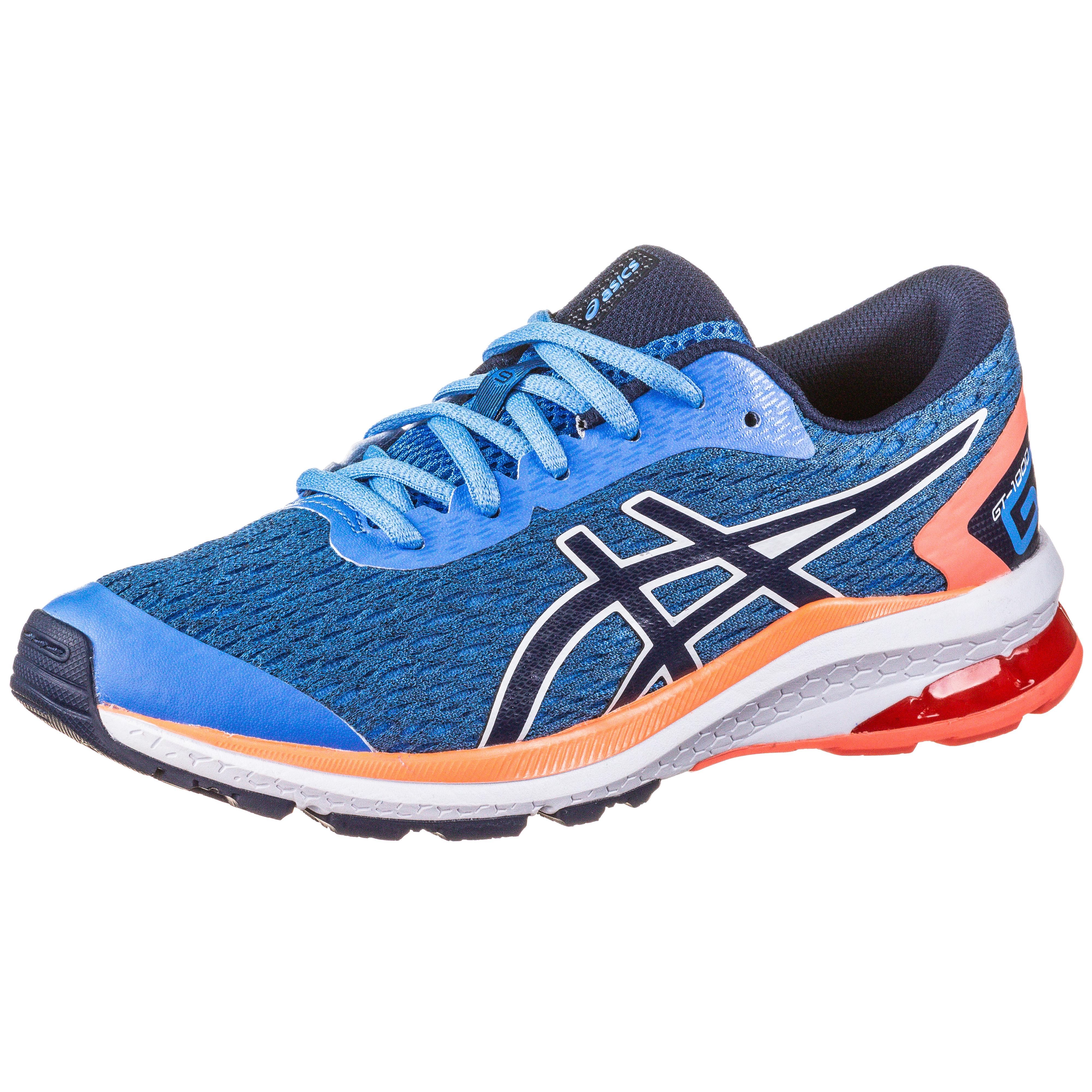 ASICS GT-1000 9 GS. Laufschuhe für Kinder, aus nahezu nahtlosem und atmungsaktivem Mesh; stabilisierende Overlays; klassische Schnürung; schützende Fersenkappe; gepolsterter Fersenbereich; dämpfende DuoMax™- Mittelsohle mit zusätzlich dämpfender GEL™-Technologie im Rückfußbereich; atmungsaktives Meshfutter; herausnehmbare Einlegesohle: Gewicht: ca. 246 g (Gr. 36/ einzeln); abriebfeste Außensohle.