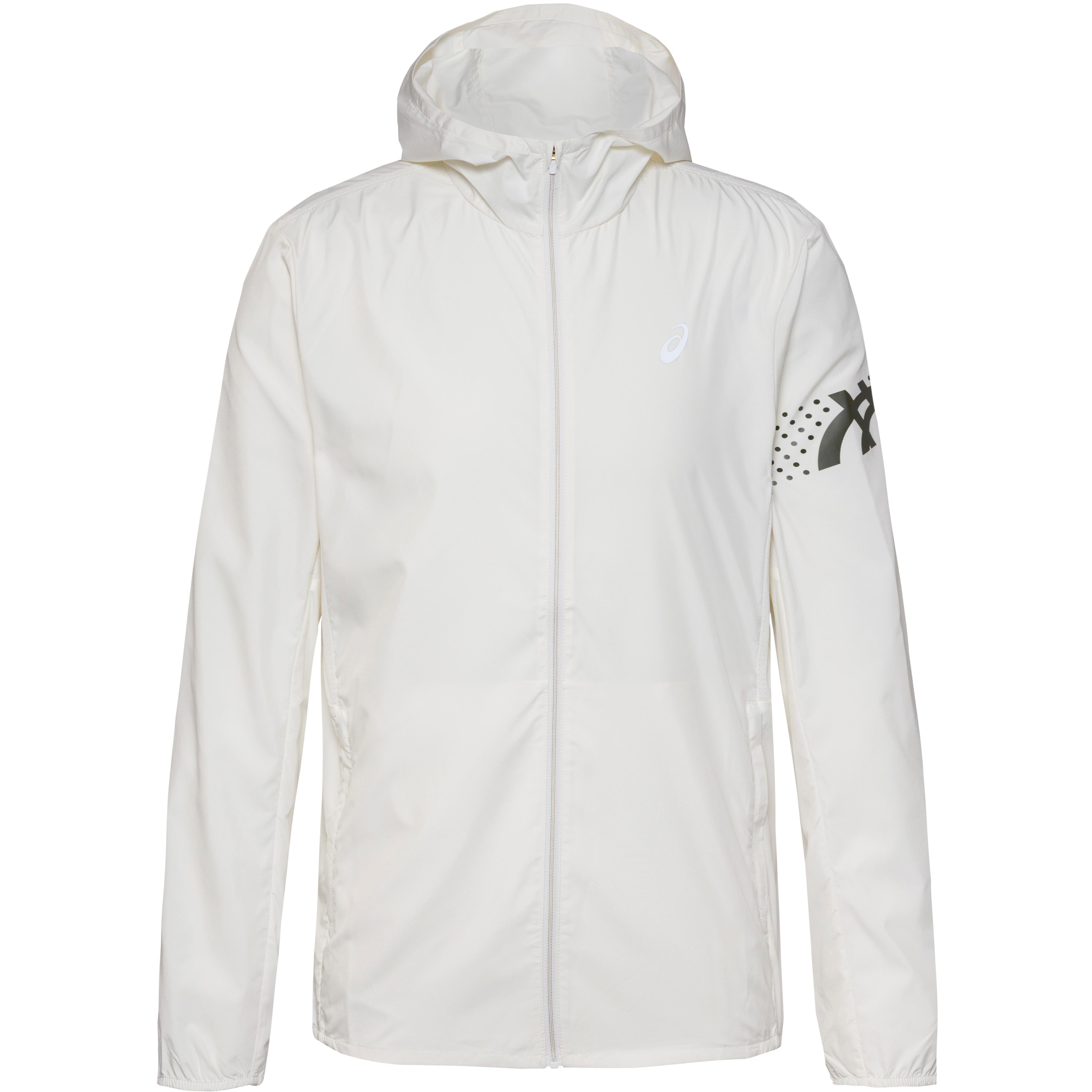 Laufjacke mit wasserabweisender Imprägnierung; Kapuze; hochabschließender Kragen mit Kinnschutz; die seitlichen Belüftungsbereiche sorgen für angenehme Ventilation beim Lauf; verdeckte Seitentaschen mit Reißverschlüssen; Markendetails; reflektierende Elemente; Material 100% Polyester (recycelt), Material I 90% Polyester (88% recycelt), 10% Elastan.