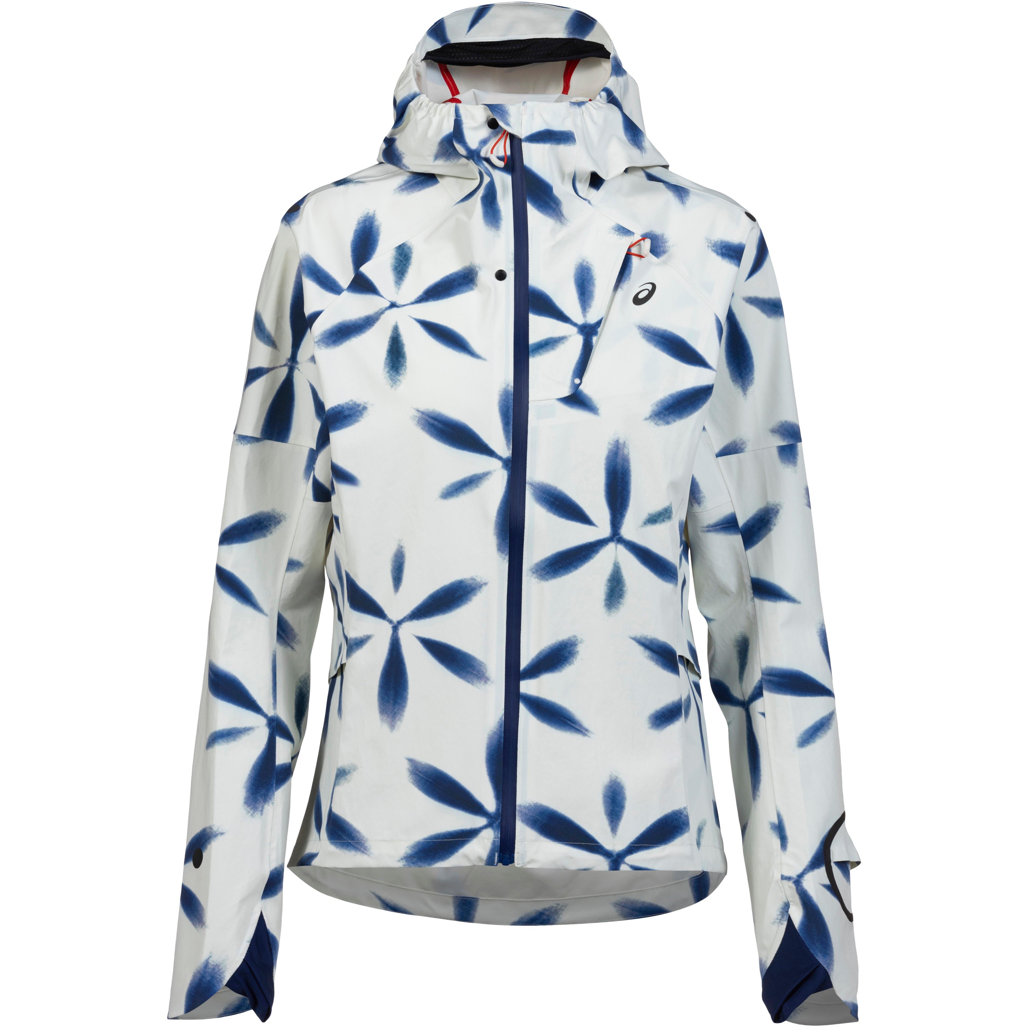 Leichte, wasserdichte Laufjacke mit floralem Allover-Print, inspiriert von der japanischen Shibori-Färbetechnik; vollständig versiegelte Nähte; Kapuze mit Verstellmöglichkeit auf der Rückseite und integriertem Blendschutz; durchgehender Frontreißverschluss mit Kinnschutz am Kragen; kleine Brusttasche mit Reißverschluss; 2 verdeckte, seitliche Eingrifftaschen; Belüftungsöffnungen am Rücken; Ärmelbündchen mit Daumenschlaufen und Öffnung für eine Sportuhr; Saum mit Kordelzug weitenregulierbar; reflektierende Details; Material 88% Polyamid, 12% Elastan.
