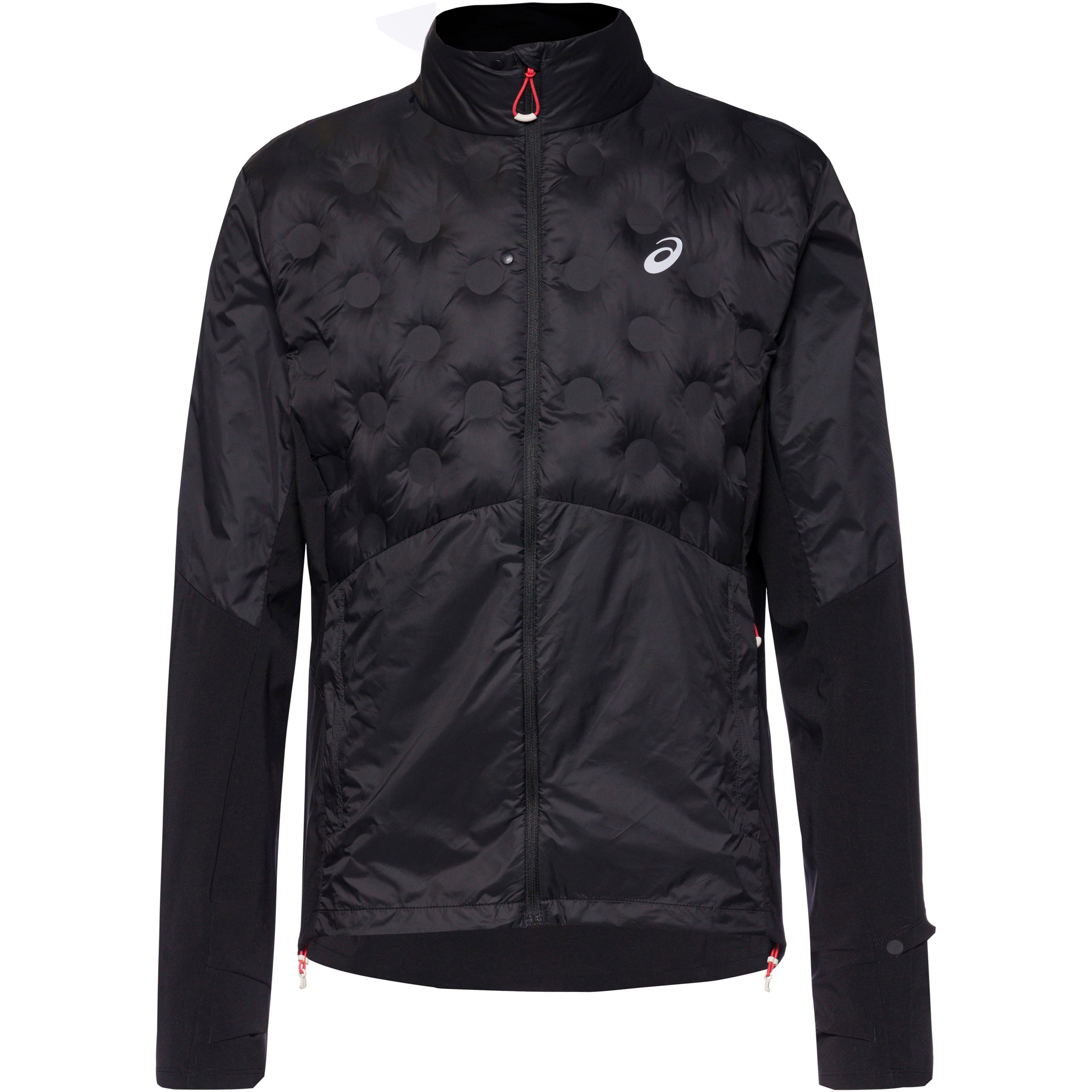 Hybrid-Laufjacke mit isolierender Front; das Stretchgewebe sorgt für optimale Bewegungsfreiheit; Armabschlüsse mit Daumenlöchern; hinterlegter Frontreißverschluss; verdeckte Seitentaschen mit Reißverschlüssen; verlängerte Zippbändchen; Markendetails; reflektierende Elemente; weitenregulierbarer Saum mit integriertem Stopper; Obermaterial I 100% Polyamid (recycelt), Obermaterial II 87% Polyester (recycelt), 13% Elastan, Futter 92% Polyester (recycelt), 8% Elastan, Füllung 100% Polyester.
