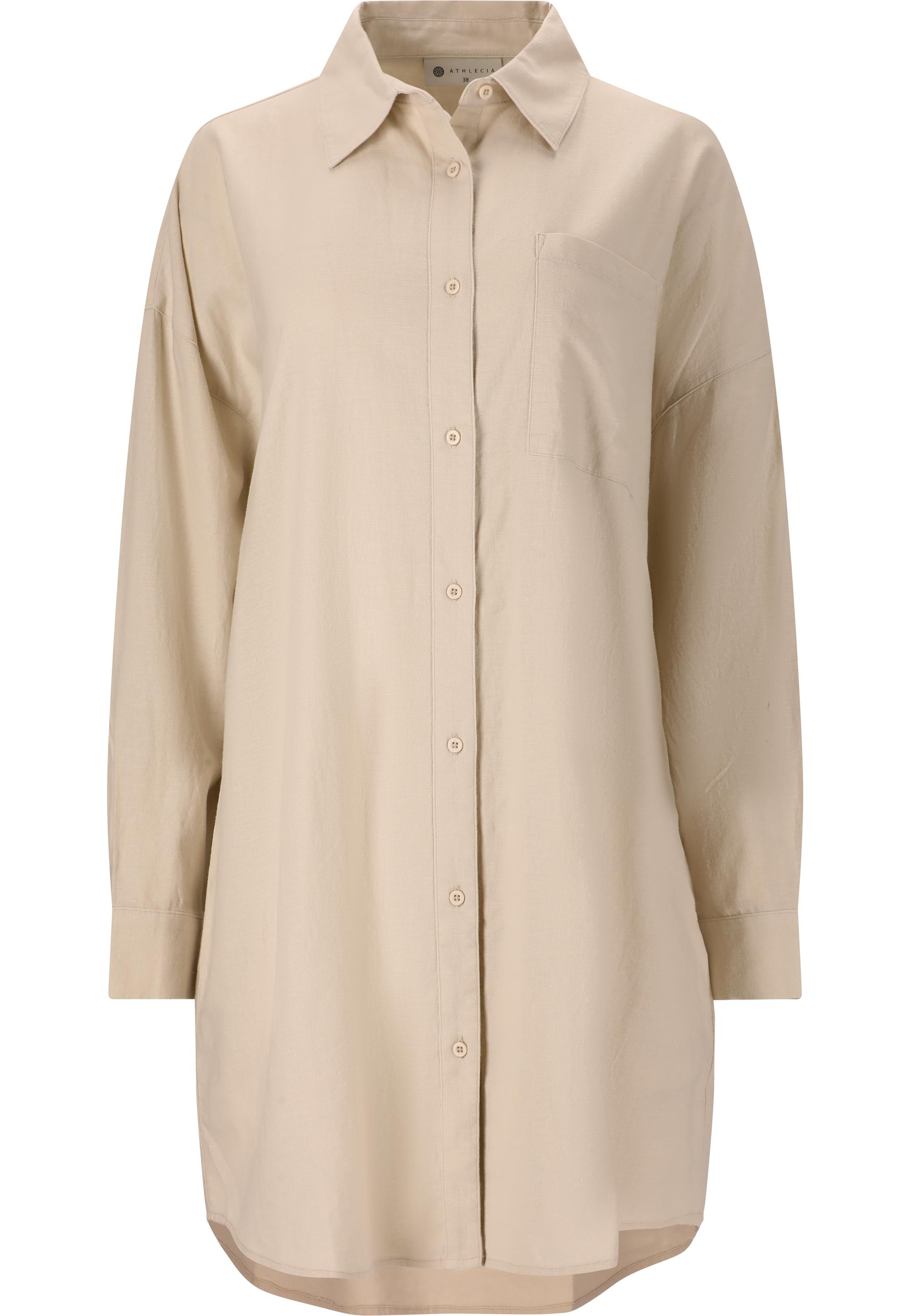 Das Kleid "Resort" von Athlecia vereint Komfort, Stil und Funktionalität. Hergestellt aus einem atmungsaktiven Materialmix aus 55% Leinen und 45% Viskose, sorgt es für ein angenehmes Tragegefühl an warmen Tagen. Mit Frontknöpfen, einer Brusttasche und Knopfverschlüssen an den Ärmeln bietet es sowohl praktische als auch stilvolle Details. Das leichte und luftige Design macht das Hemdkleid ideal für entspannte Sommeroutfits und den Alltag. Ein Must-Have für jede stilbewusste Frau, die auf der Suche nach einem vielseitigen Kleidungsstück ist.