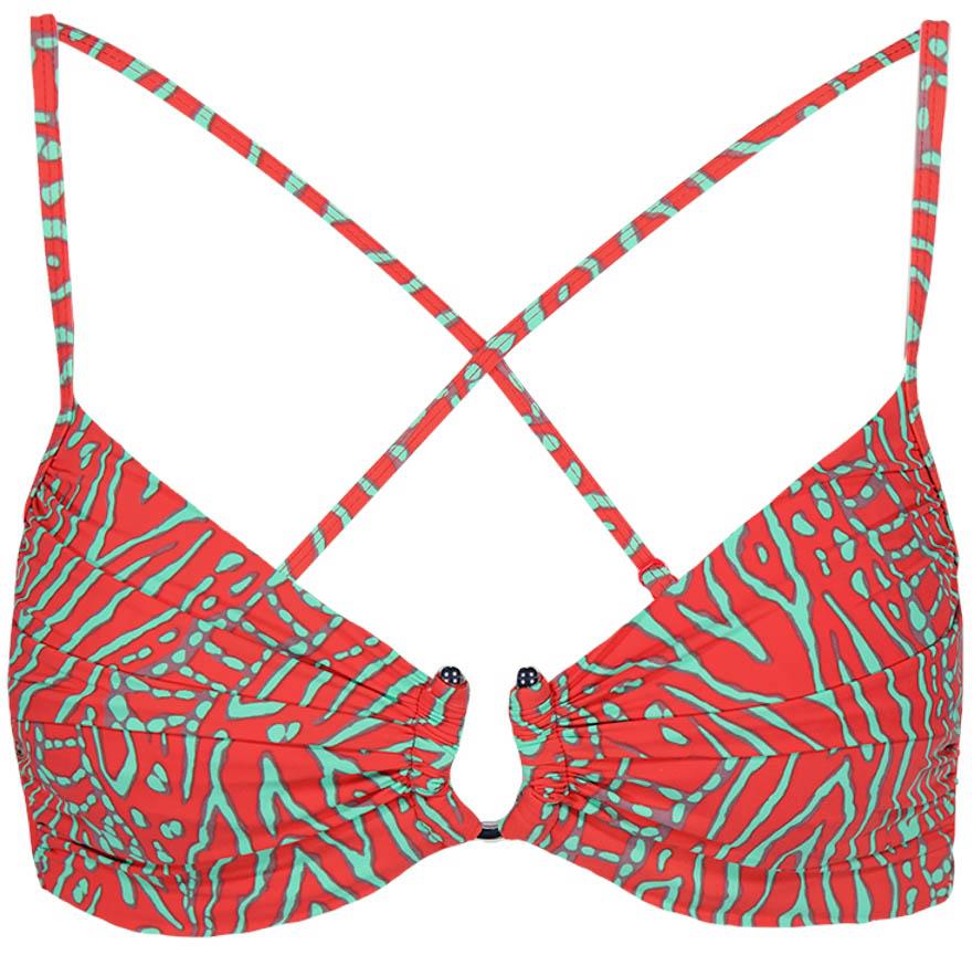 Bikini-Oberteil mit Bügel und grafischem Allover-Print; dekorative Schnalle zwischen den Cups; herausnehmbare Pads; verstellbare Spaghettiträger, die auf der Rückseite gerade oder über Kreuz verlaufen können; Hakenverschluss auf der Rückseite; Material 68% Polyamid (recycelt), 32% Elastan.