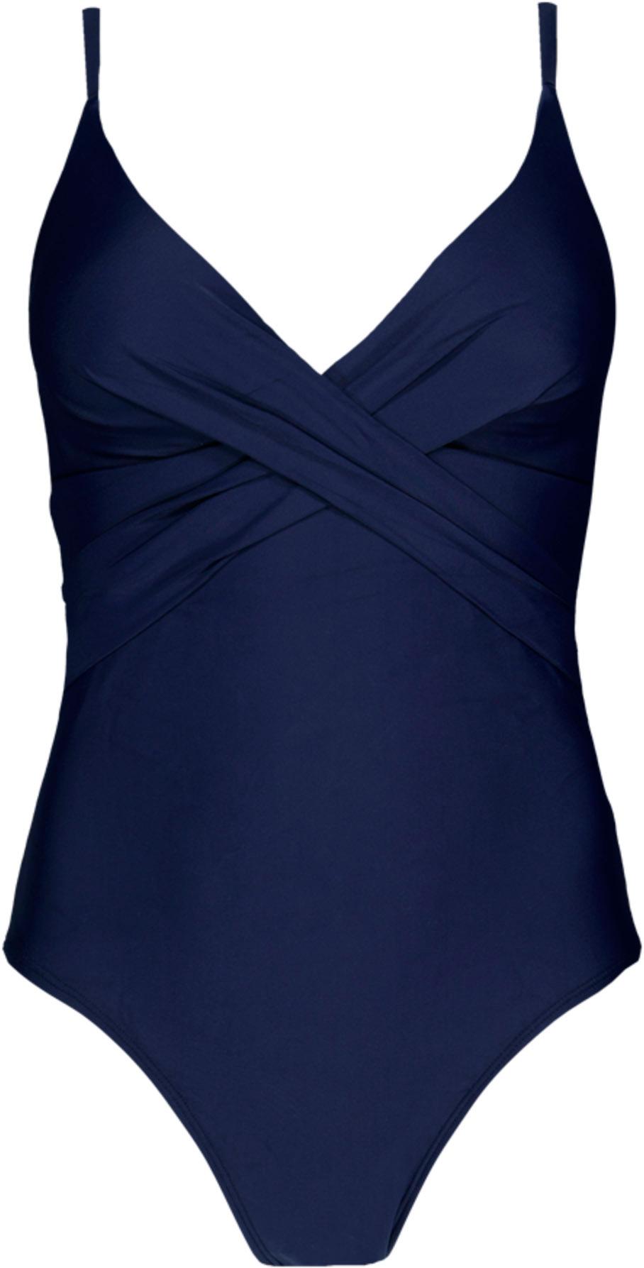 Badeanzug mit Detail in Wickeloptik auf der Vorderseite; unifarbenes Design aus elastischem Material; V-Ausschnitt; verstellbare Spaghettiträger; gerader Rückenabschluss; mittelhohe Beinausschnitte; Material 70% Polyamid, 20% Elastan, 10% Polyester.