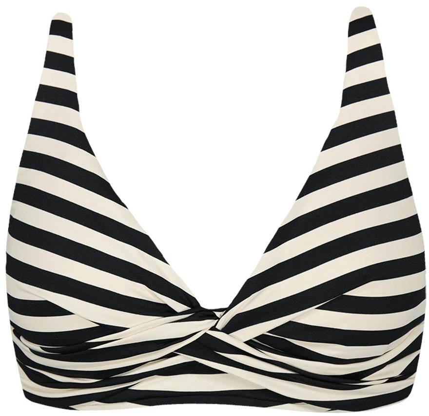 Gestreiftes Bikini-Oberteil mit Wickel-Optik zwischen den Cups; breitere, verstellbare Schulterträger, die auf der Rückseite gerade oder über Kreuz verlaufen können; Clip-Verschluss; Material 91% Polyamid, 9% Elastan.
