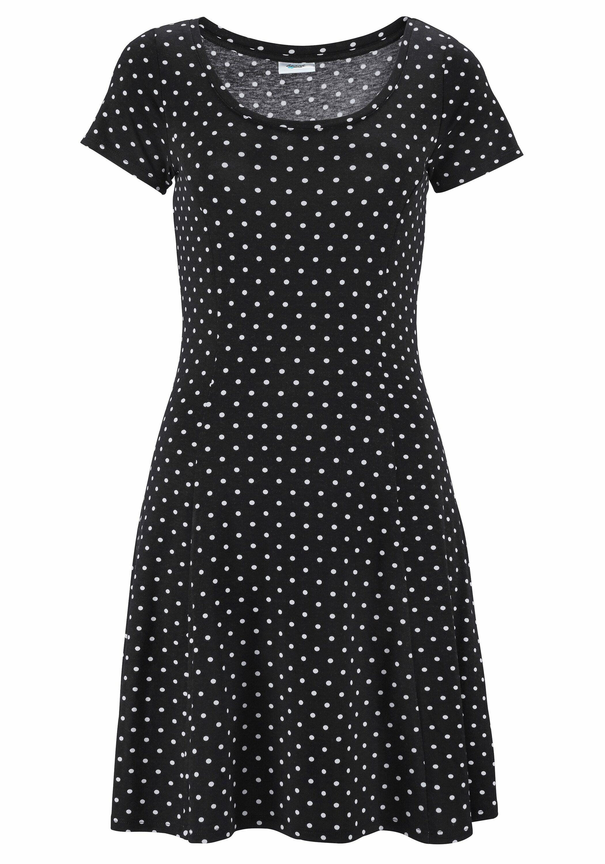 Kleid mit weißem Pünktchendruck, jedes Teil ein Unikat. Mit Rundhalsausschnitt, kurzen Ärmeln und einem Rockteil in schwingender Tellerform. Länge ca. 88 cm. Aus 95% Viskose, 5% Elasthan.