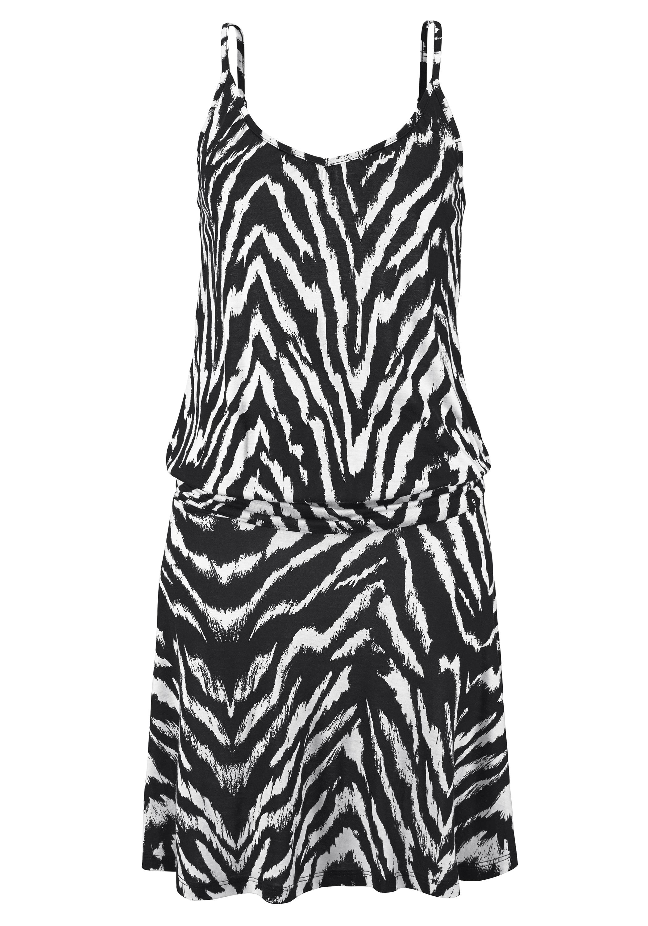 Kleid von Beachtime mit Animalprint, jedes Teil ein Unikat. Verstellbare Spaghettiträger. Aufwendige Raffungen in Hüfthöhe. Länge ca. 94 cm. Aus 100% Viskose.