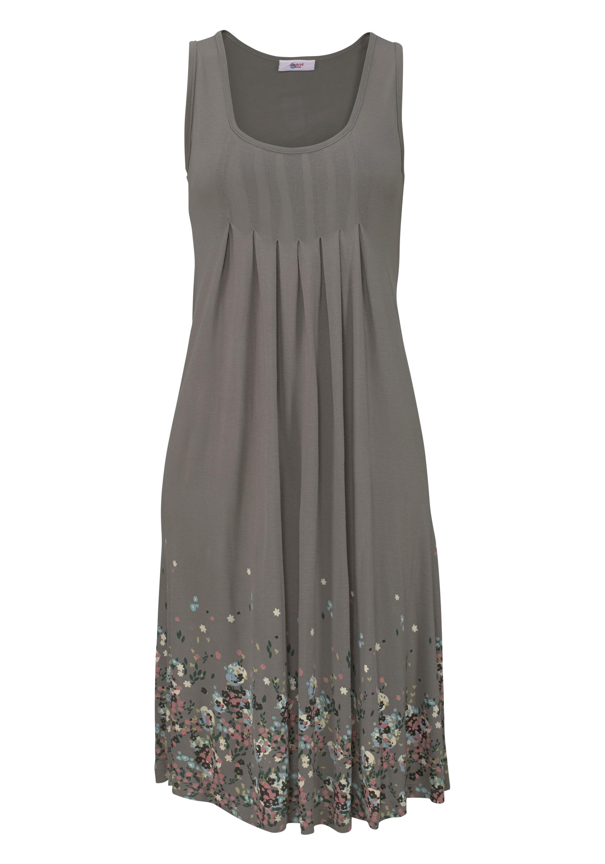 Strandkleid in Hängerchenform mit eingelten Falten unterhalb der Brust und rundum bedrucktem Rockteil. Länge ca. 90 cm. Weich fließende Qualität aus 100% Viskose.