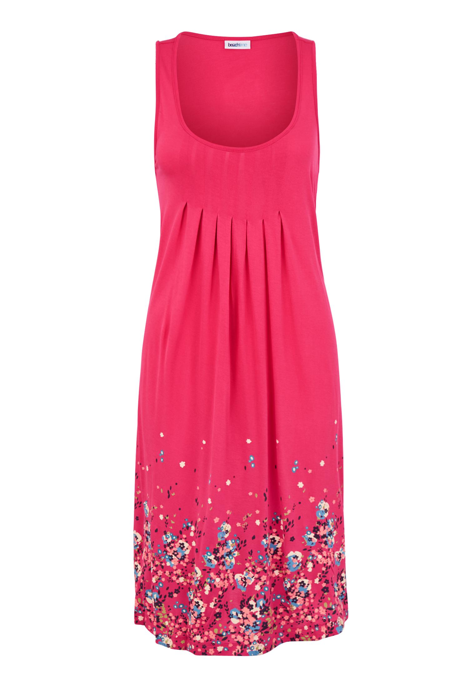 Strandkleid in Hängerchenform mit eingelten Falten unterhalb der Brust und rundum bedrucktem Rockteil. Länge ca. 90 cm. Weich fließende Qualität aus 100% Viskose.