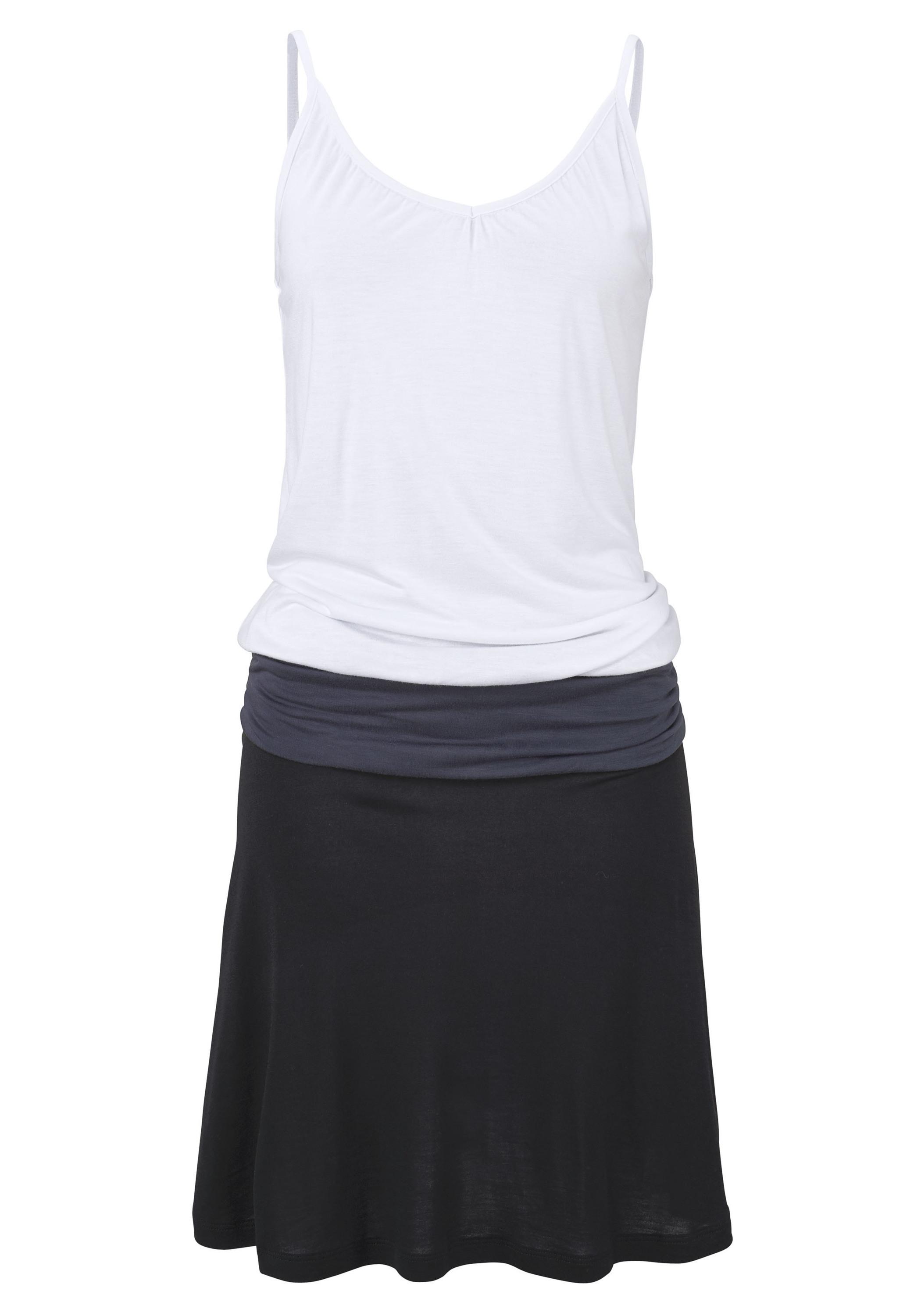 Kleid von Beachtime in unterschiedlichen Farbvarianten. Verstellbare Spaghettiträger. Aufwendige Raffungen in Hüfthöhe. Länge ca. 94 cm. Aus 100% Viskose.