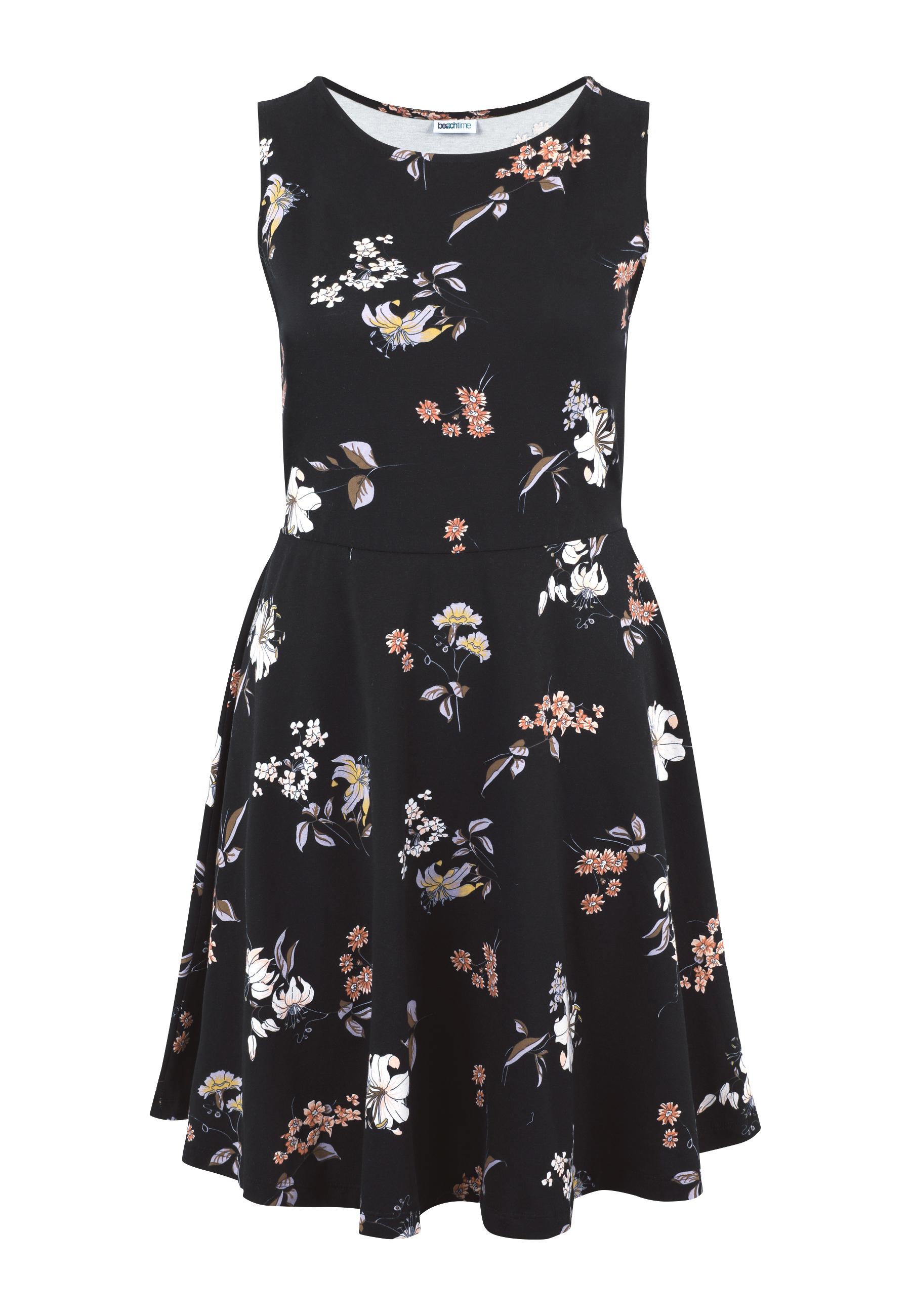 Sommerkleid im floralen Druckdessin. Ärmellose Form mit Rundhalsausschnitt. Ausgestelltes, leicht schwingendes Rockteil. Länge ca. 88 cm. Weiche Qualität aus 95% Baumwolle (unterstützt Cotton made in Africa), 5% Elasthan.