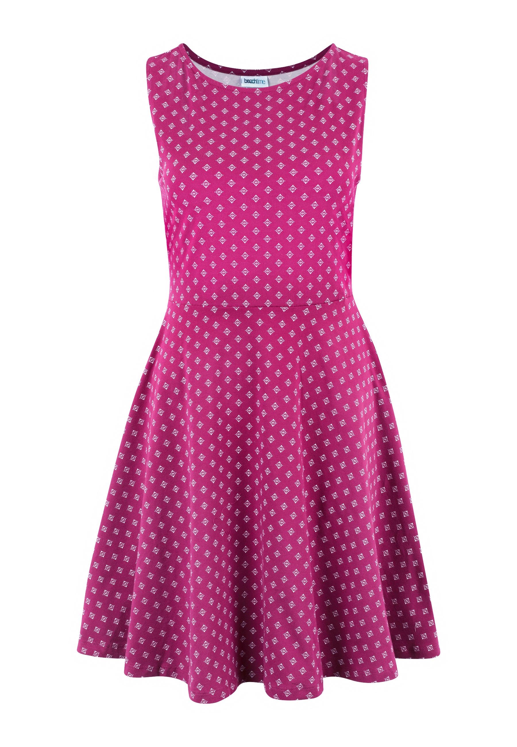 Beachtime Strandkleid mit breiten Tanktopträgern. Schöner Rundhalsausschnitt vorne. Hinten normal geschnitten. Ausgestelltes, leicht schwingendes Rockteil. Allover bedruckt, jedes Teil ein Unikat. Rückenlänge ca. 88 cm. Aus 95% Baumwolle, 5% Elasthan.