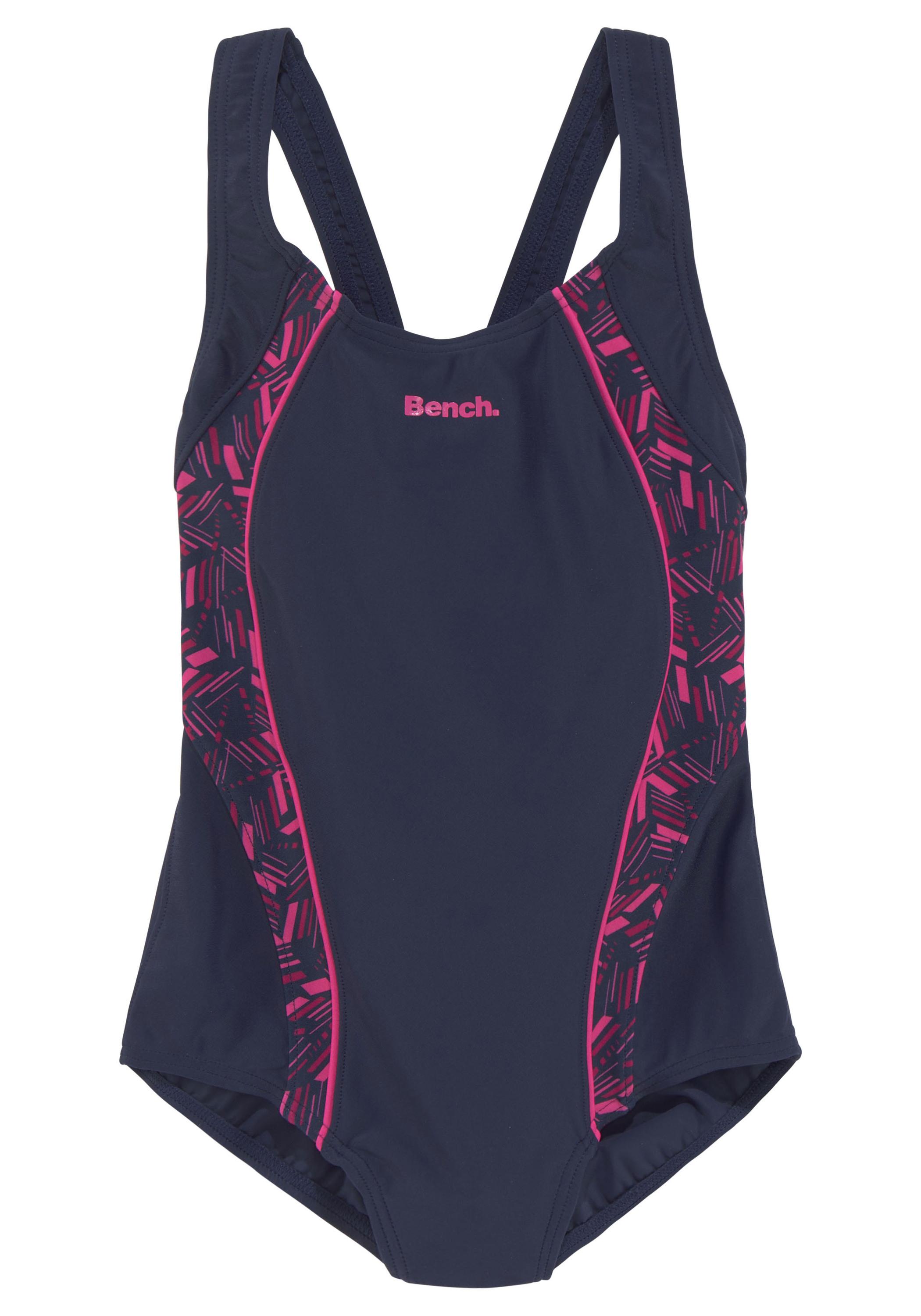 Badeanzug von Bench. In sportlicher Optik mit Ringerrücken. Bedruckte Einsätze im geometrischem Design. Aus recyceltem Polyamid. Obermaterial: 80% Polyamid, 20% Elasthan. Futter: 92% Polyester, 8% Elasthan