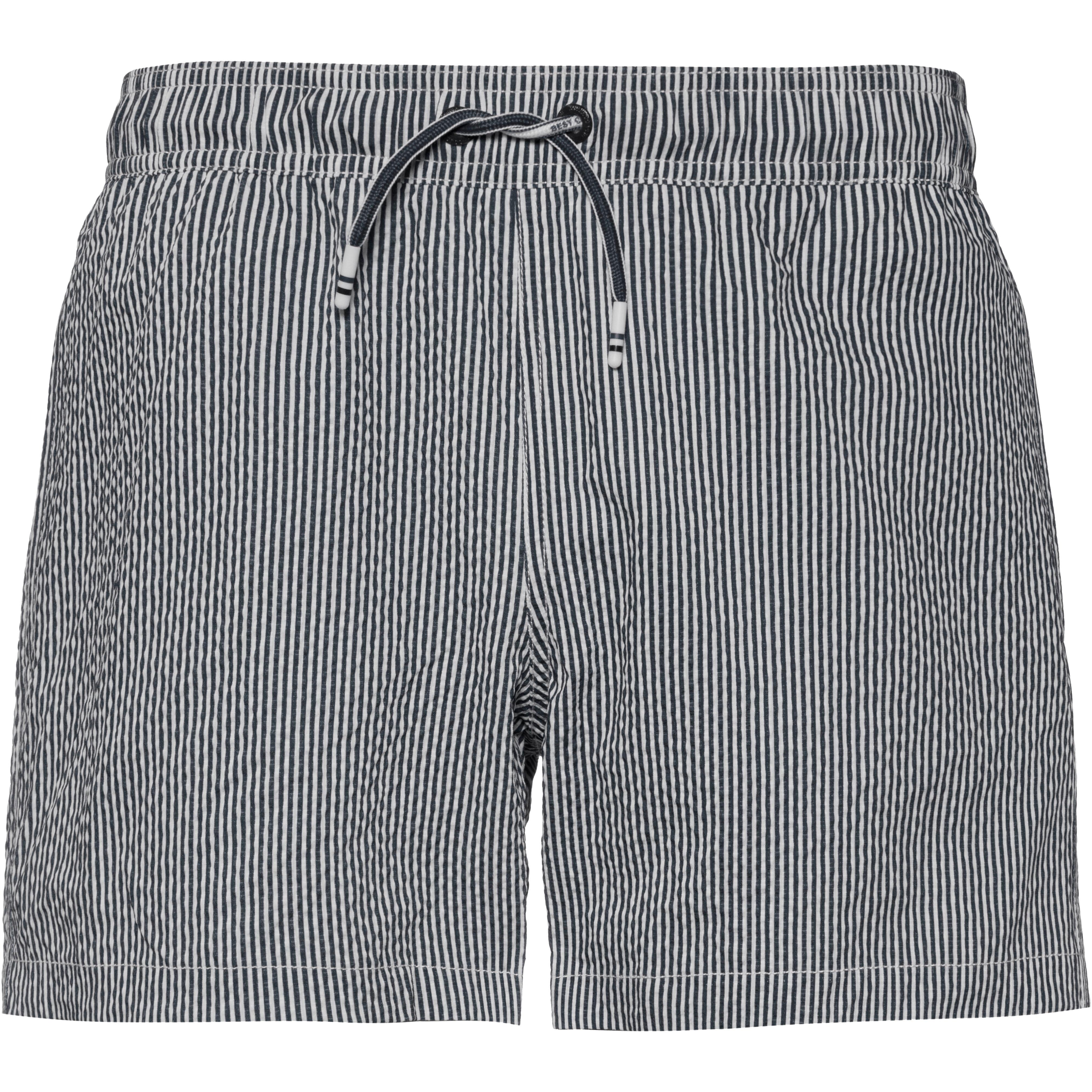 Gestreifte Badeshorts mit integriertem Slip aus Mesh; weitenregulierbarer Elastikbund mit integriertem Kordelzug; seitliche Eingriffstaschen; 1 Gesäßtasche mit Klettverschluss und Wasserablauföse; Obermaterial 100% Polyester, Futter 94% Polyester, 6% Elastan.