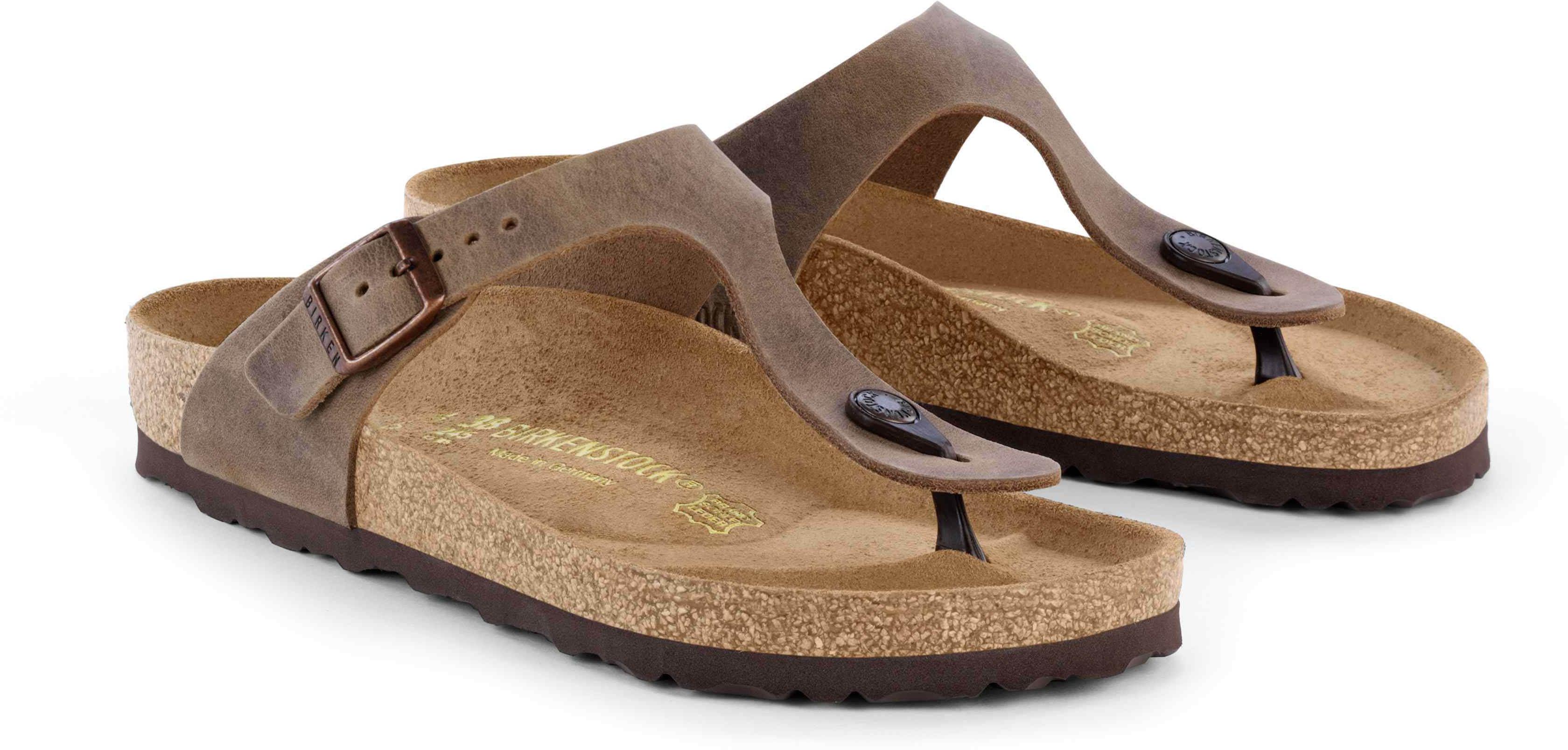 Zehensteg-Sandalen in minimalistischem Design; mit individuell verstellbarer Dornschnalle aus Metall; Obermaterial aus besonders dickem, geöltem Nubukleder in offenkantiger Verarbeitung; anatomisch geformtes Kork-Latex-Fußbett; Decksohle aus Veloursleder; EVA-Außensohle; Made in Germany.