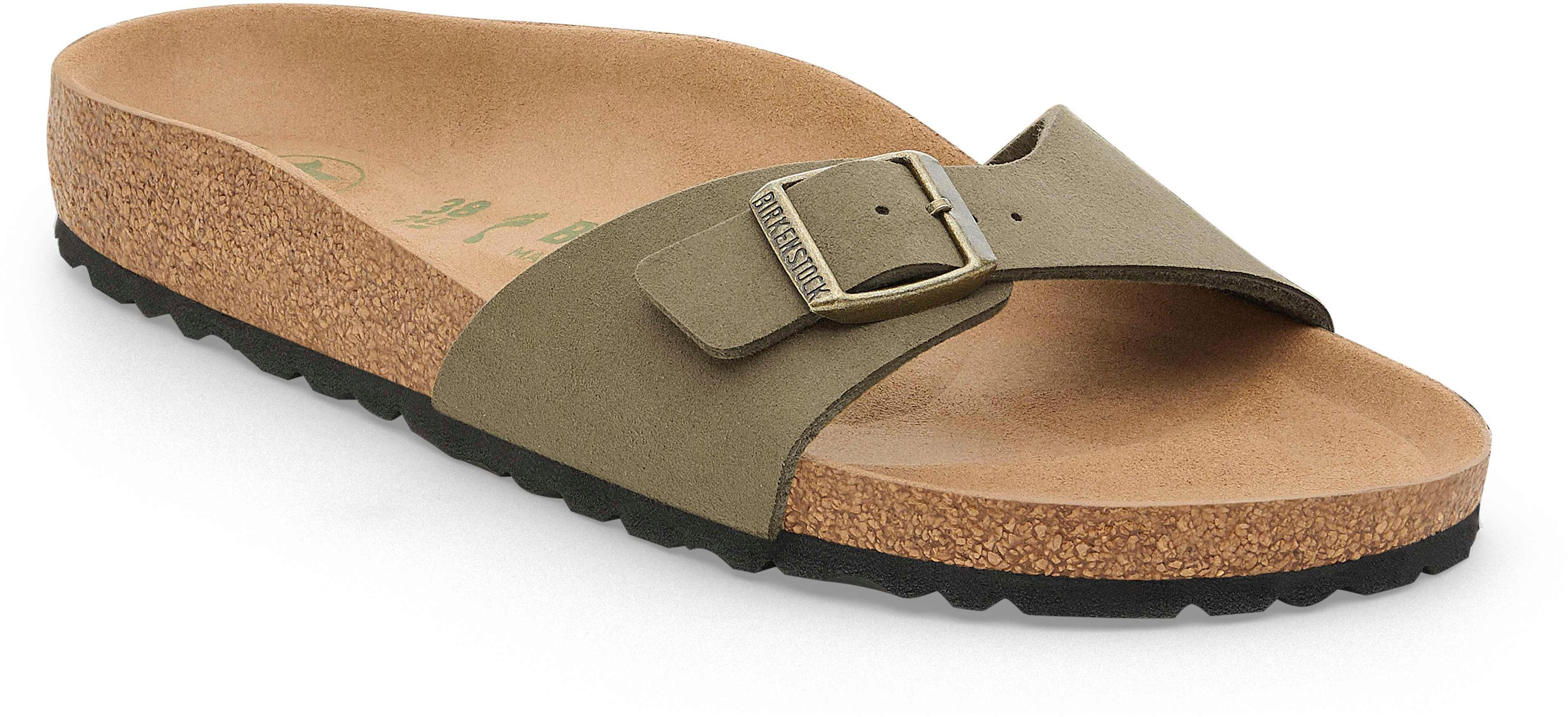 Sandalen mit einem Riemen aus hautfreundlichem Synthetikmaterial; per Dornschnalle verstellbar; anatomisch geformtes Kork-Latex-Fußbett; abriebfeste EVA-Außensohle; vegan; Made in Germany.