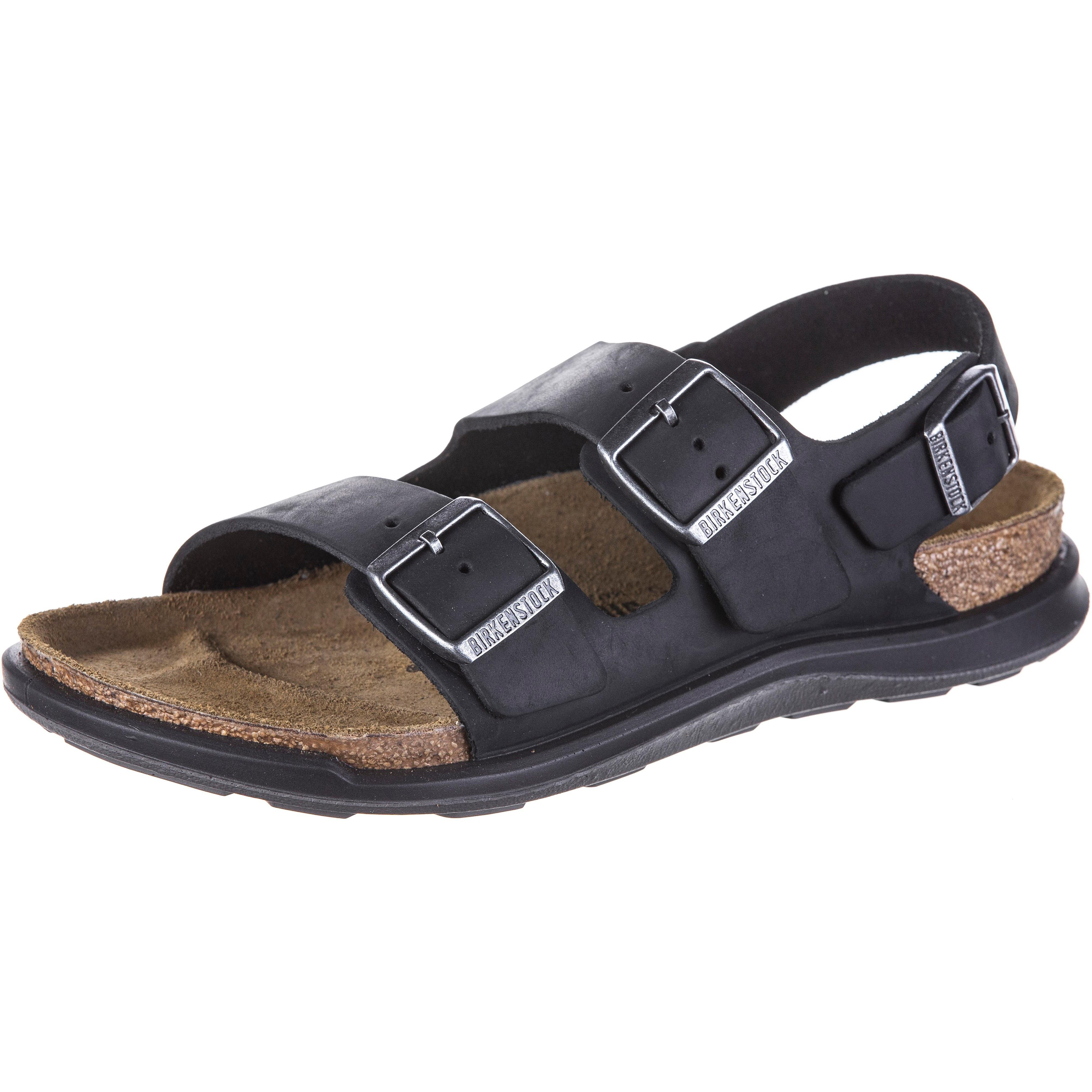 Outdoor-Sandalen in stabilisierender Passform mit 2 Lederriemen auf der Oberseite und einem breiten Fersenriemen; per Dornschnallen aus Metall verstellbar; Decksohle aus Veloursleder; anatomisch geformtes Kork-Latex-Fußbett; Außensohle mit griffigem Profil; normale Schuhweite; Made in Germany.