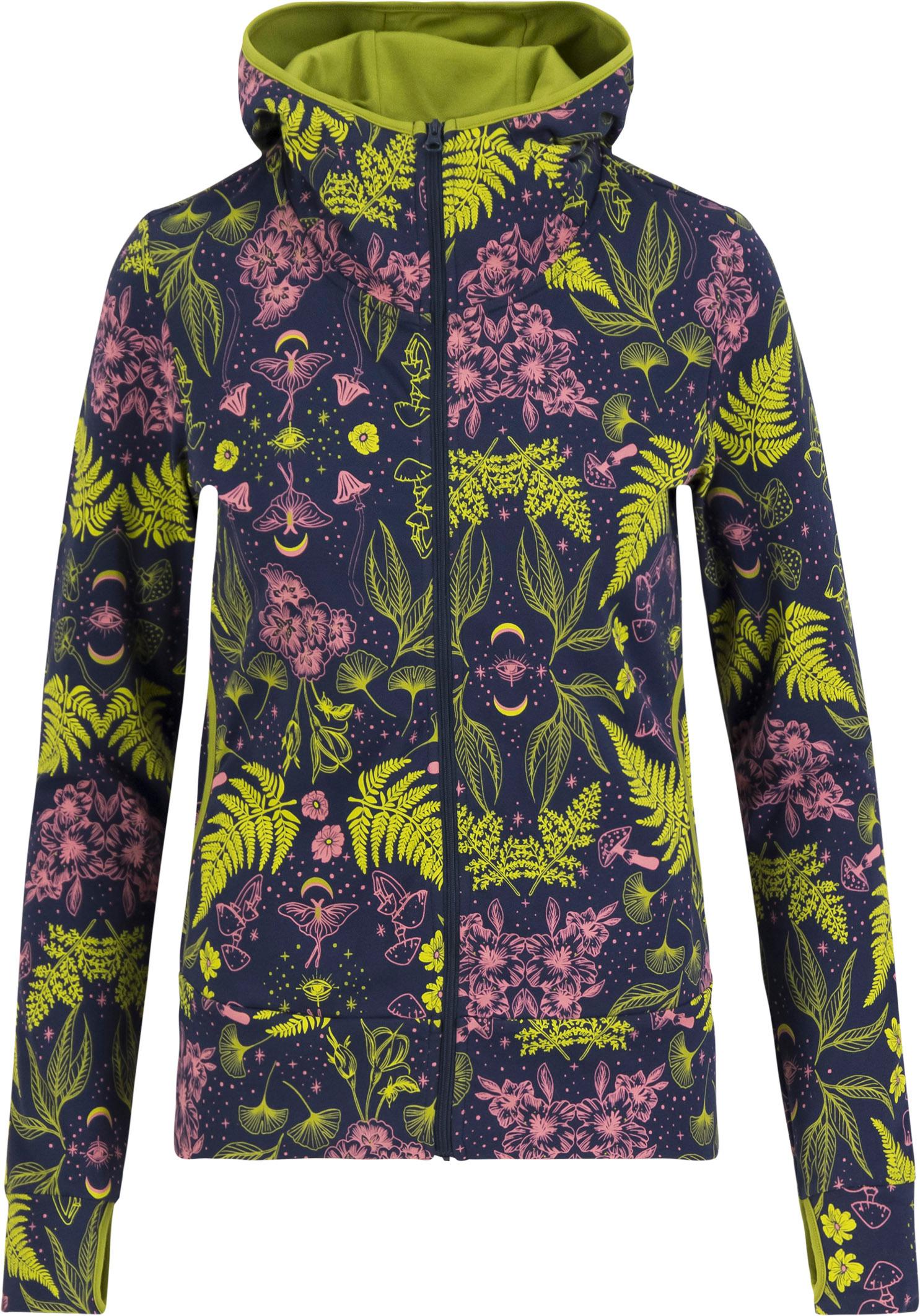 Sweatjacke mit buntem Muster; Kapuze mit hohem Kragen; durchgehender zentraler Reißverschluss; 2 offene Seitentaschen; Ärmelbündchen mit Daumenlöchern; Fair Wear; GOTS-zertifiziert; Material 95% Baumwolle (Biobaumwolle), 5% Elastan.