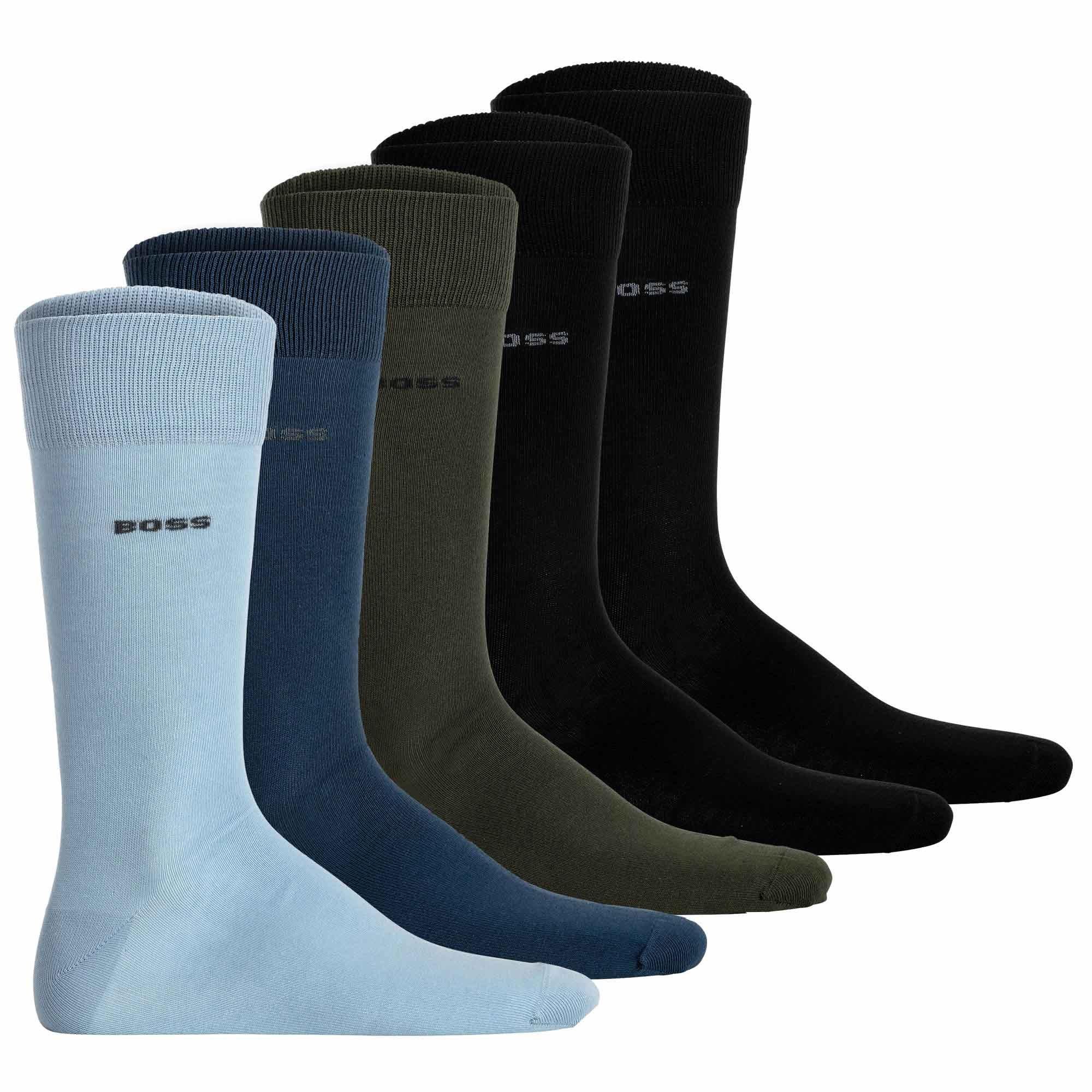 Fünf Paar mittelhohe Socken für Herren von der Marke BOSS. Dezentes Logo am Schaft. Bequeme Rippbündchen. Hoher Baumwollanteil für angenehmes Tragegefühl.
