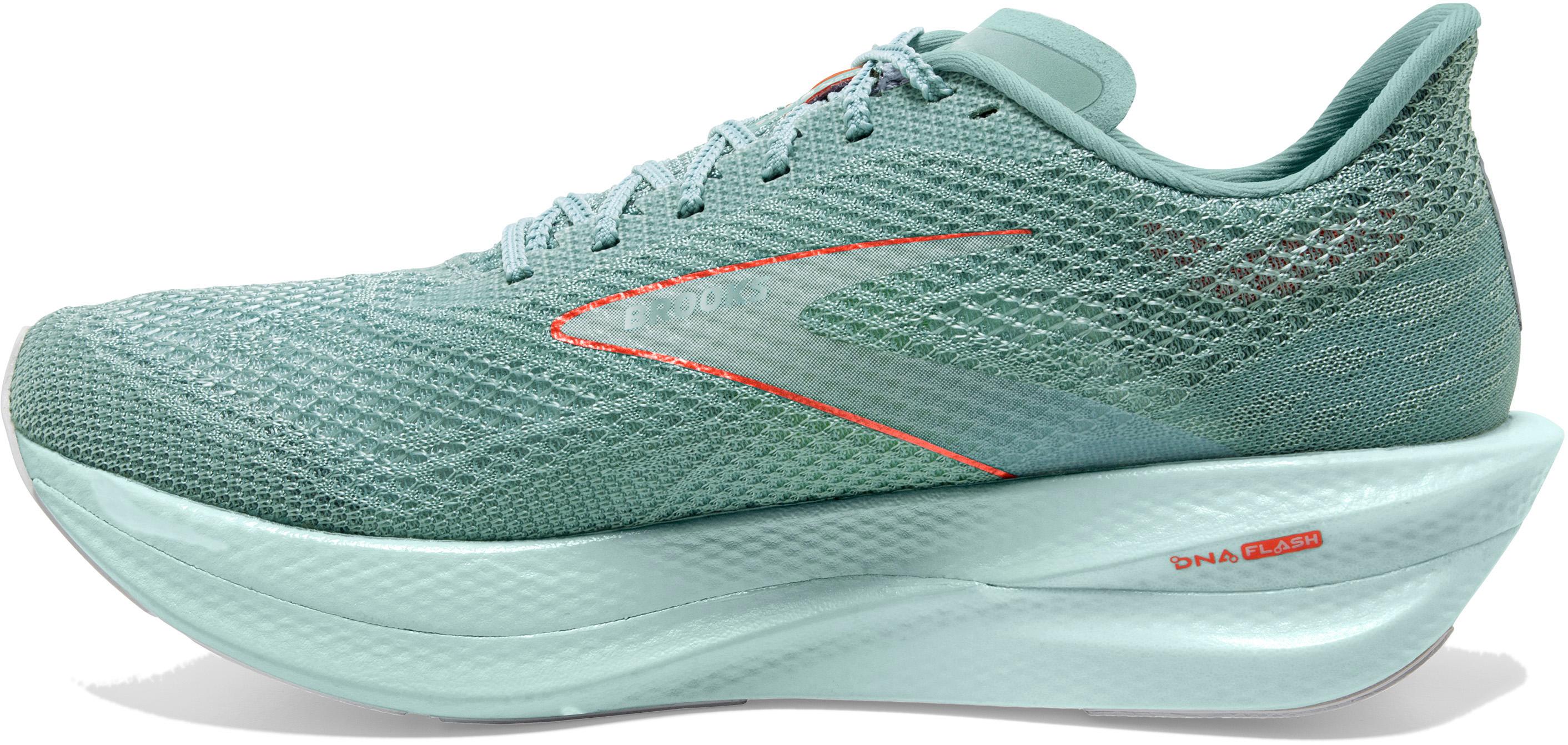 Laufschuhe für Wettkämpfe und Straßenbeläge; atmungsaktives Mesh-Obermaterial; klassische Schnürung; sockenähnlicher Schaft; Textilfutter; die mit Stickstoff angereicherte DNA Flash-Zwischensohle bietet ein ultraleichtes und langlebiges Material für Energierückführung und konstant hohe Geschwindigkeiten; die relativ breite Zwischensohle und die Propulsion Plate aus Carbonfaser sorgen zusammen dafür, den Läufer in seinem bevorzugten Bewegungsablauf zu halten und so Energie zu sparen, um länger schneller laufen zu können; Rapid Roll-Technologie; leicht profilierte Außensohle aus Gummi.