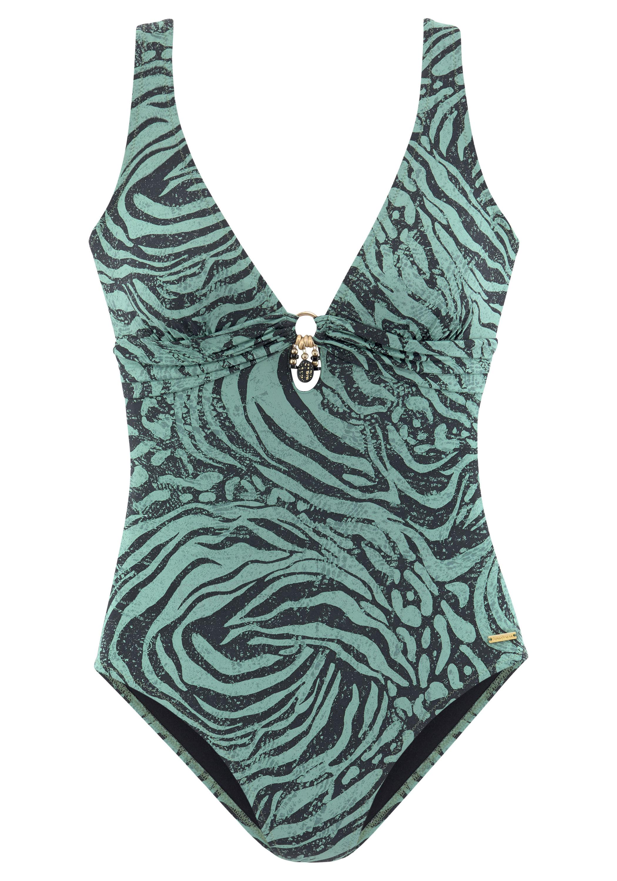 Schöner Badeanzug von Bruno Banani. Modischer Alloverprint mit Metallic-Schimmer und einem Schmuckelement zwischen den Cups. Extratiefer V-Ausschnitt. Shaping-Einsatz vorn. Weiche Microfaser-Qualität.