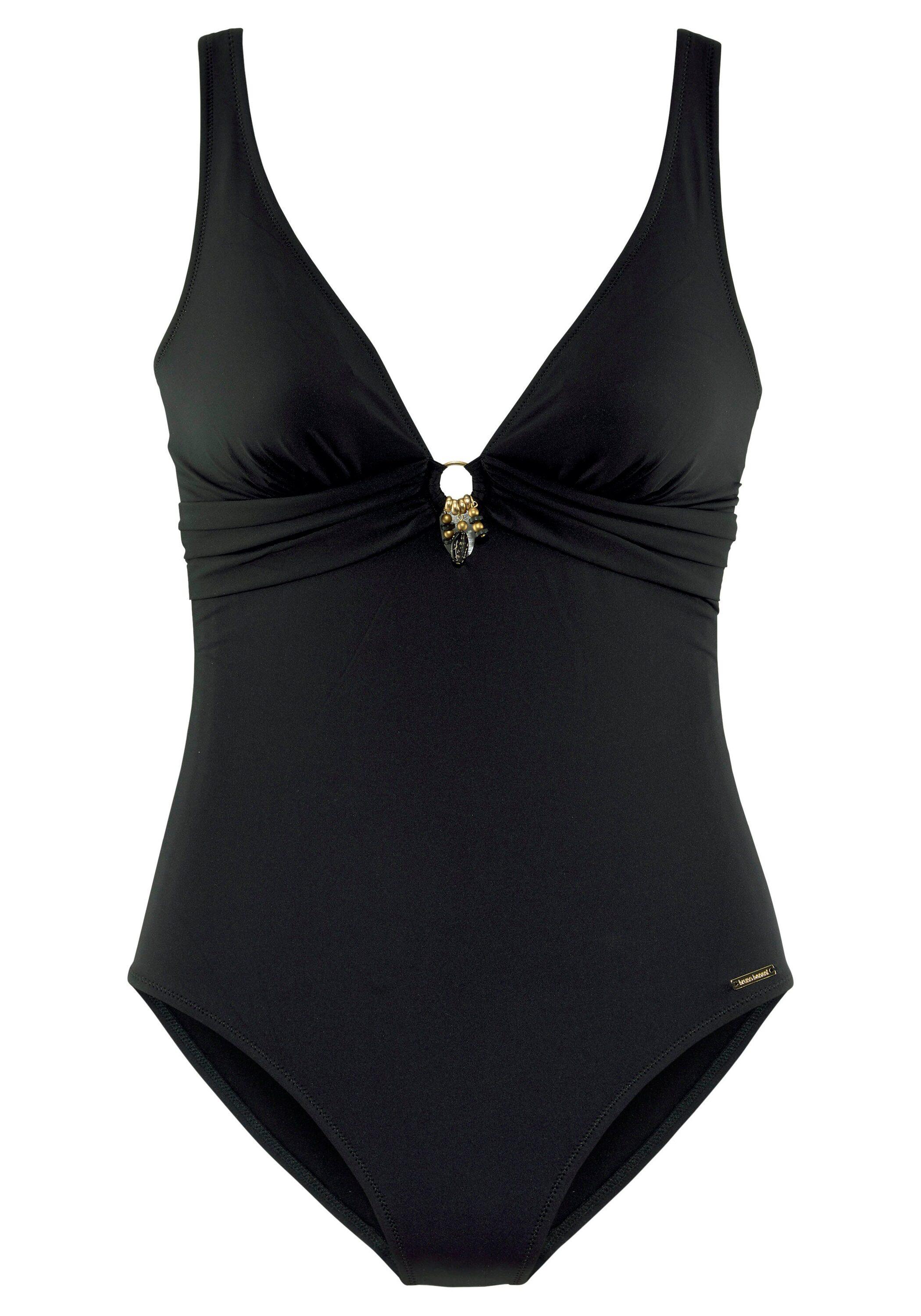 Modisch unifarbener Badeanzug von Bruno Banani. Schönes Schmuckelement zwischen den regulierbaren Cups. Tiefer Ausschnitt an Vorder- und Rückseite. Klassische Passform. Weiche Microfaser-Qualität.