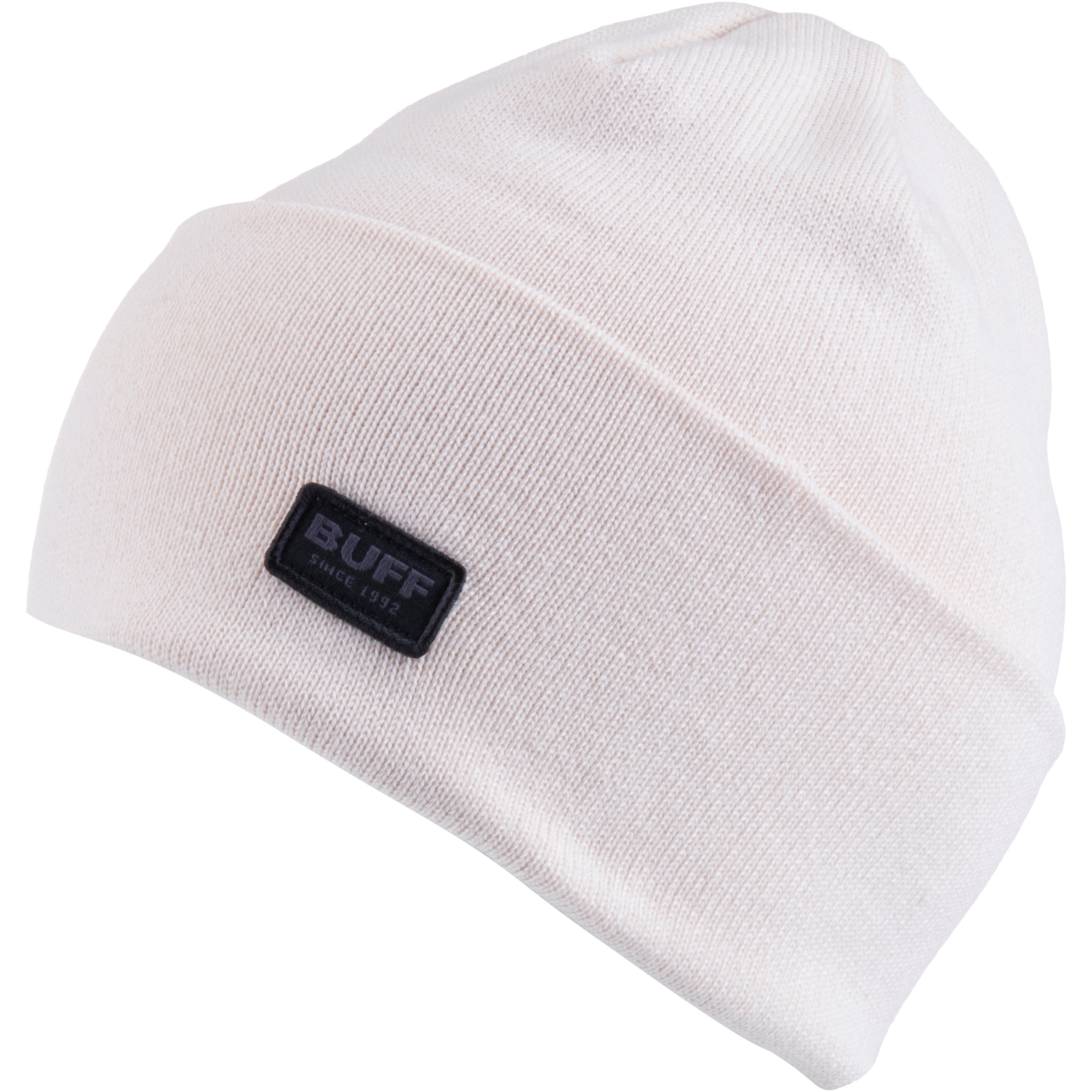 Fein gestrickte Mütze für den Winter; sehr breiter Umschlag; Label-Patch; wärmende Eigenschaft; Material 83% Polyacryl, 12% Wolle, 5% Baumwolle.