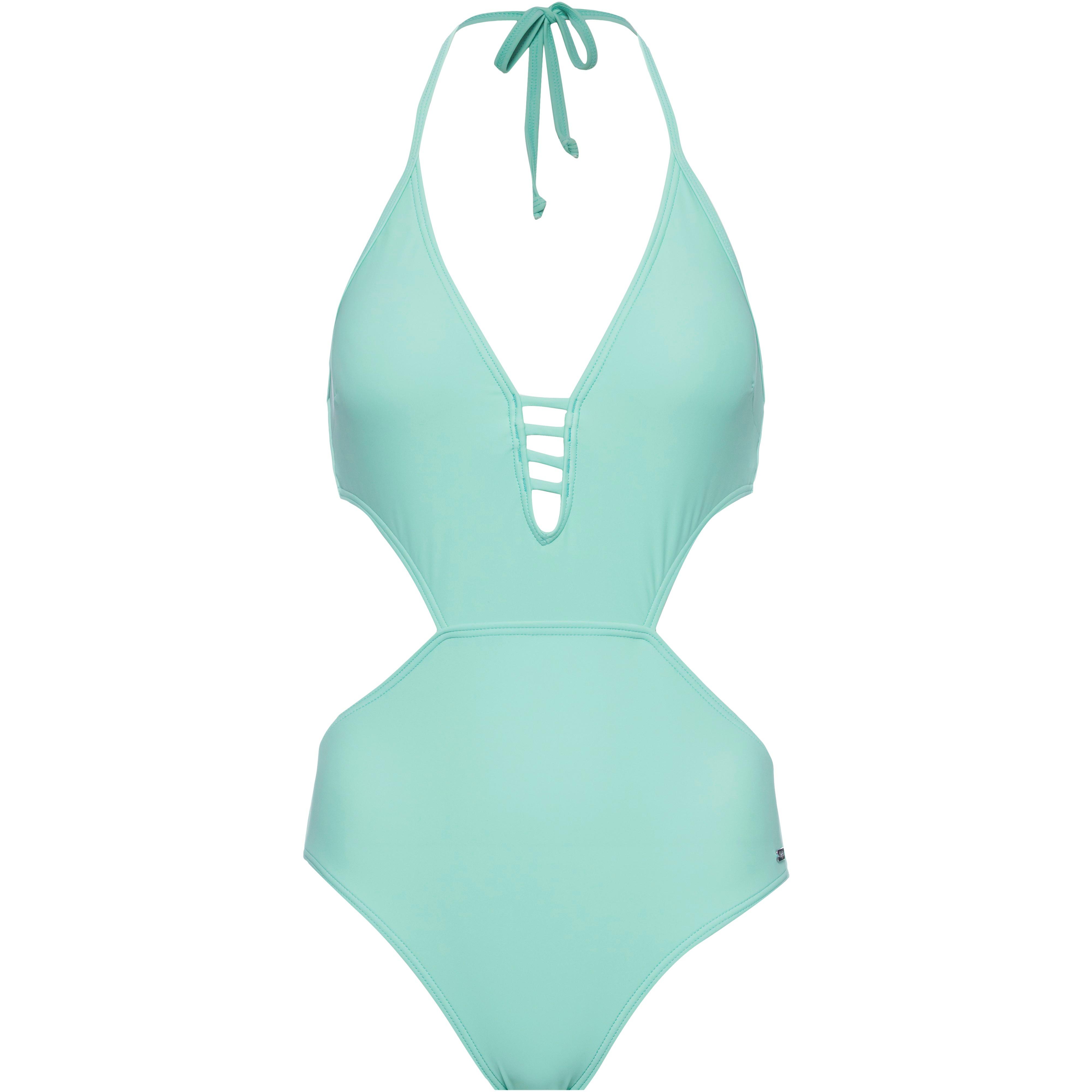 Stylisher Badeanzug im Monokini-Design, mit großen seitlichen Cut-outs; tiefer V-Ausschnitt mit Zierschnürung; Neckholder zum Binden; Klick-Verschluss im Rückenbereich; herausnehmbare Softschalen; Recyclingmaterial; Material I 82% Polyamid, 18% Elastan, Material II 100% Polyester.