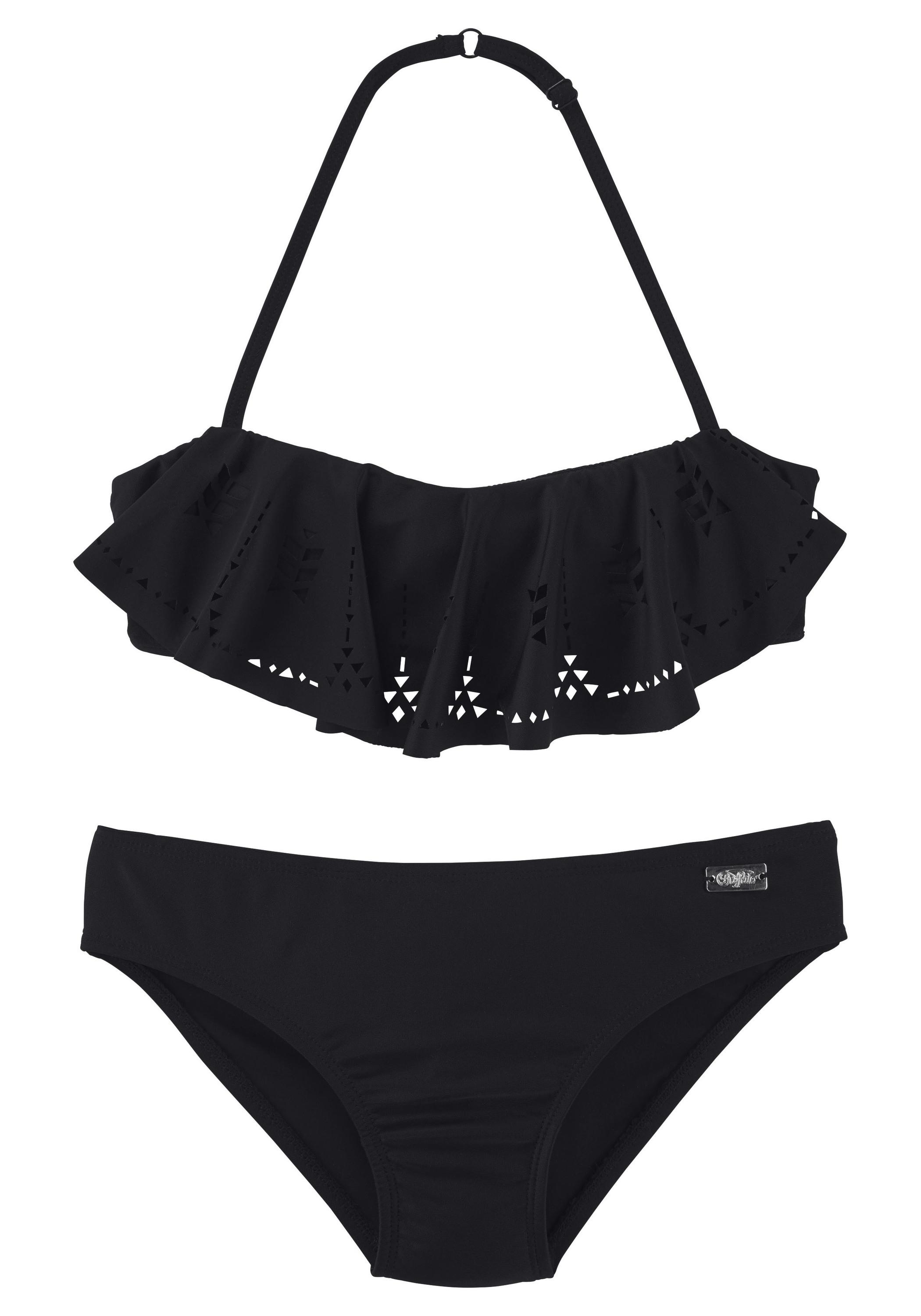 Mit modischer Rüsche am Top. Träger im Nacken verstellbar. Bikini gefüttert. Herausnehmbare Cups ab Größe 158/164. Top mit seitlichen Stäbchen.