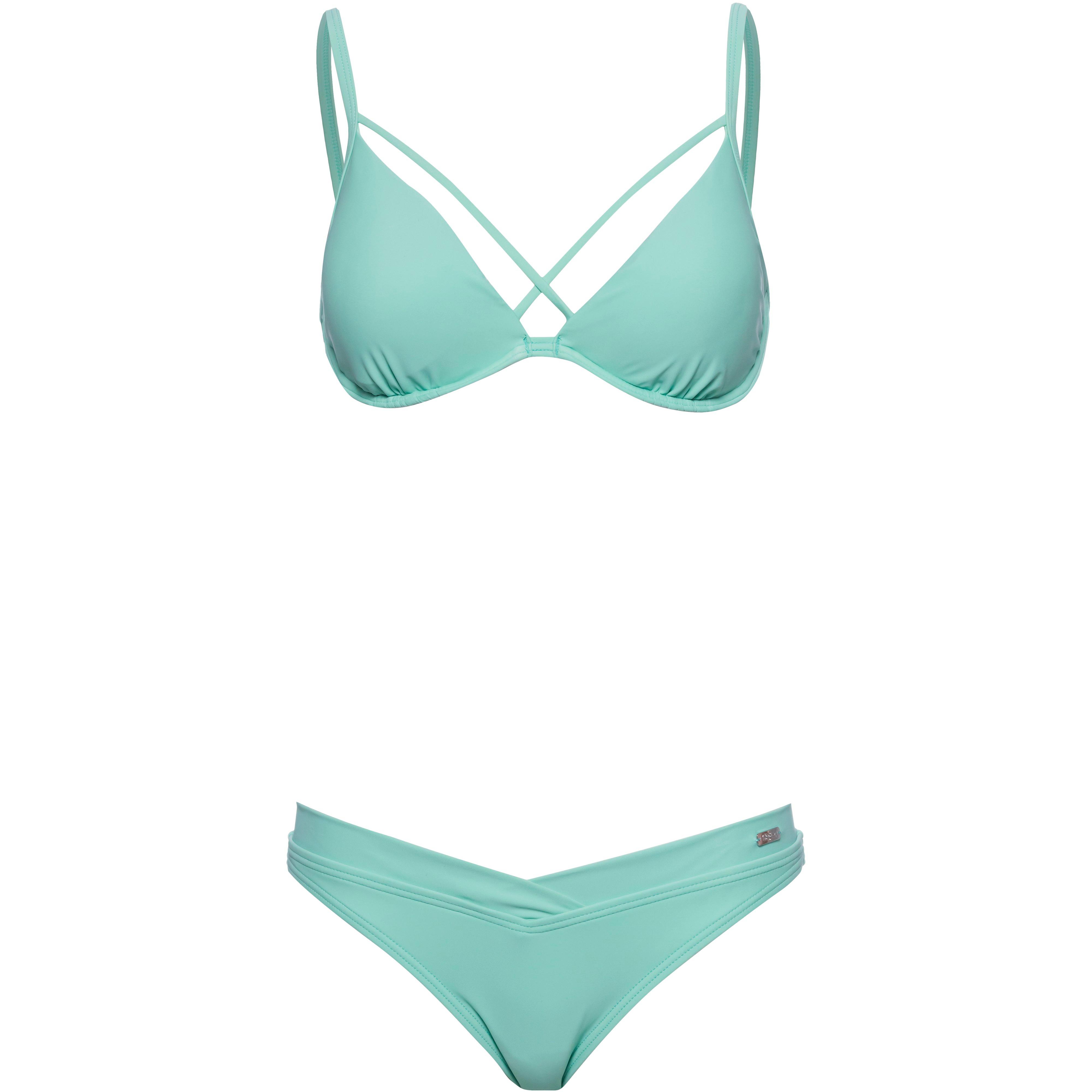 Bikini Set aus schnelltrocknendem Gewebe; Balconette Oberteil mit Bügel; Zierbänder über dem Dekolleté; herausnehmbare Softpads; Längen verstellbare Träger; Bikinihose mit V-Bündchen; Recyclingmaterial; Material I 82% Polyamid, 18% Elastan, Material II 100% Polyester.