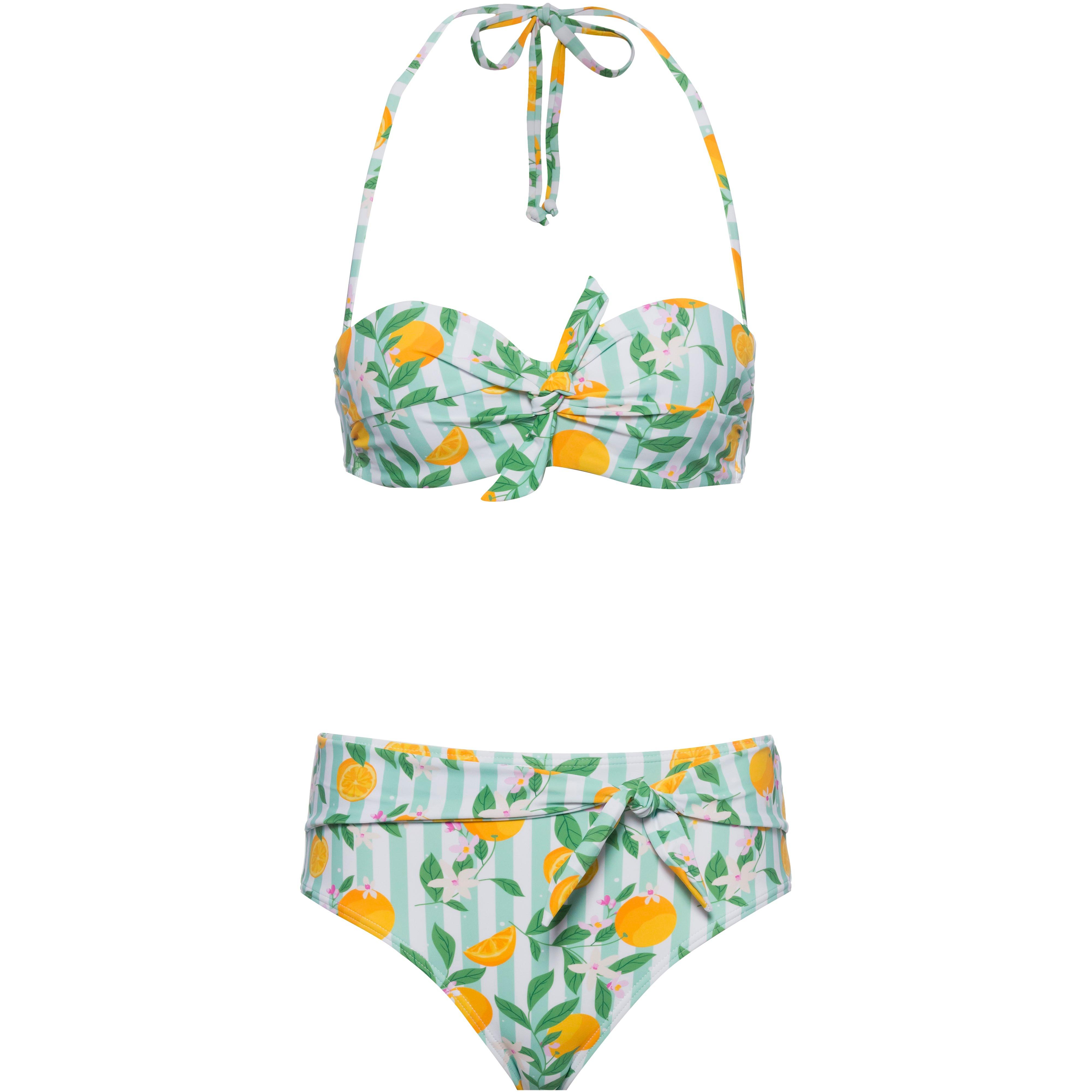 Bikini Set mit Allover-Print; Bikini Oberteil in Bandeau Passform, mit Bügel; Zierschleife in der vorderen Mitte; abnehmbare Neckholder Träger zum Binden; seitliche, integrierte Stäbchen für optimalen Sitz; Klick-Verschluss im Rückenbereich; wattierte Cups mit zusätzlichen, herausnehmbaren Pads für Push-up Effekt; High Waist Bikini Hose in Slip Passform; Zierschleife auf der Front; breite Seiten für angenehmen Tragekomfort; Recyclingmaterial; Material I 82% Polyamid, 18% Elastan, Material II 100% Polyester.