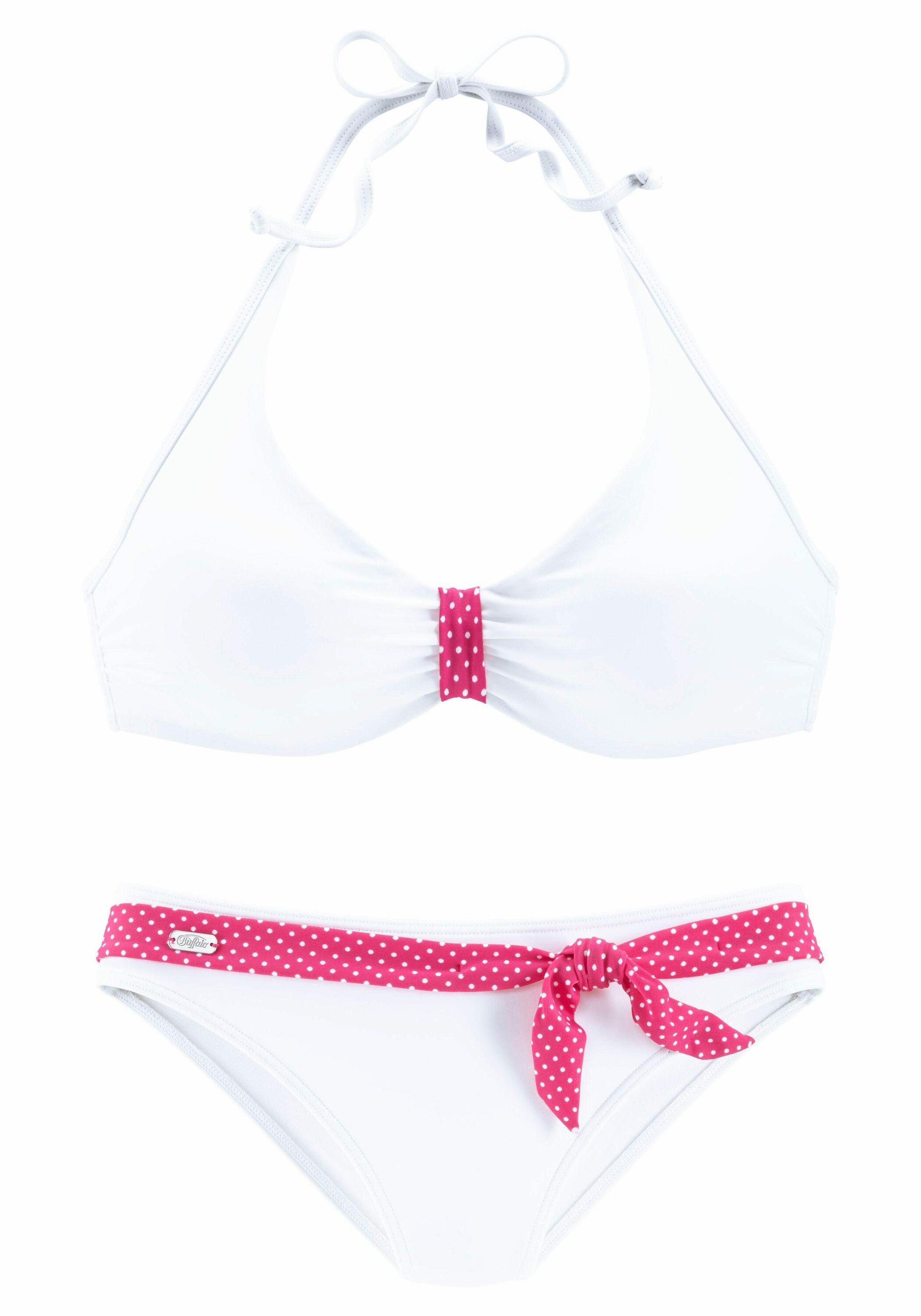 Im süßen Look mit gepunktetem Einsatz am Top. Hose vorn mit Ziergürtel im Pünktchen-Design. Top mit seitlichen Stäbchen für einen bessseren Halt. Im Nacken zu binden und im Rücken zu schließen. Top in Marine und Schwarz leicht gefüttert. Bikini in Weiß leicht gefüttert.