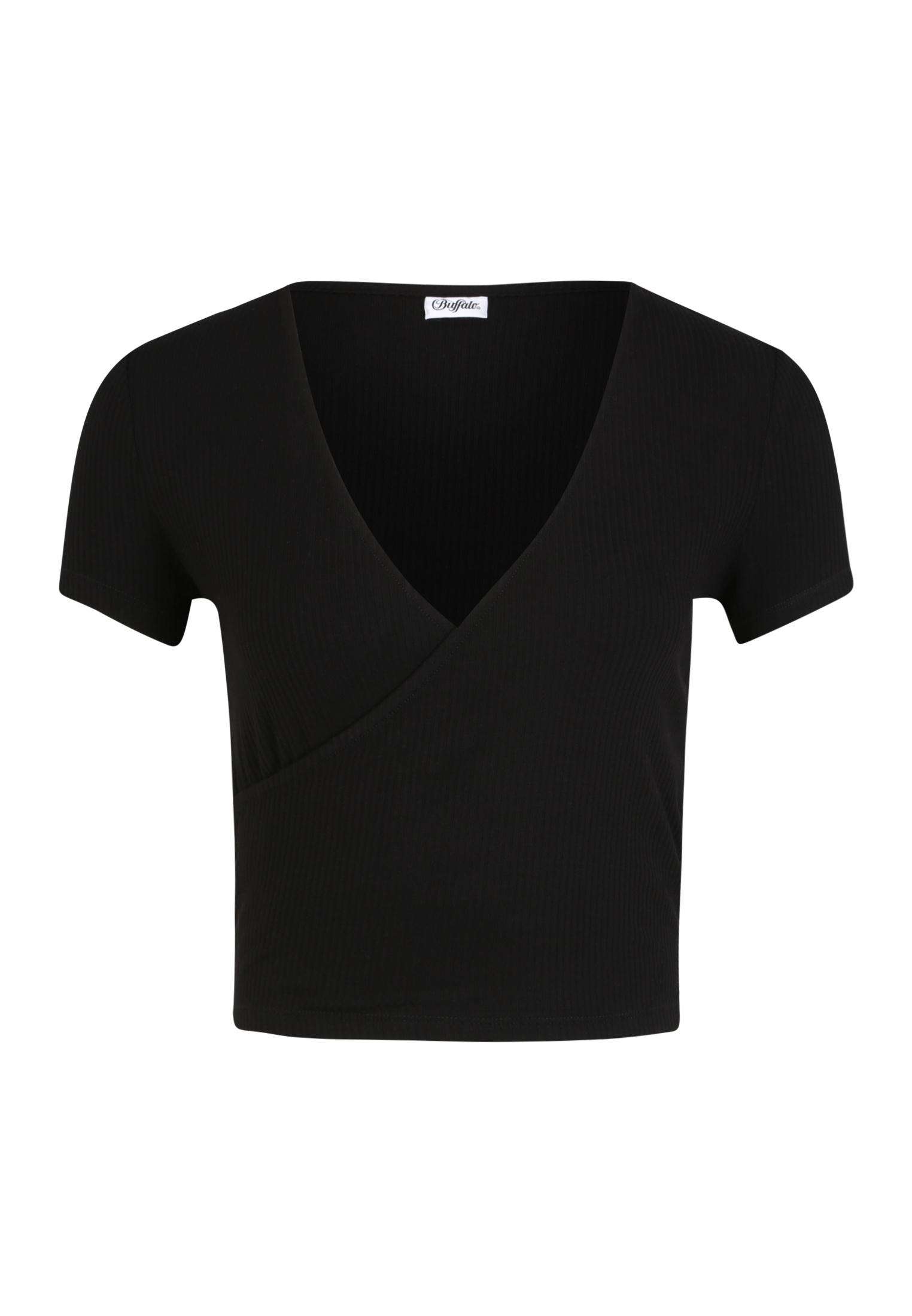 Modisches Crop-Shirt von Buffalo mit tiefem V-Ausschnitt in Wickeloptik. Kurze Ärmel. Sehr figurbetonte Passform. Vielseitig zu stylen. Feinripp-Qualität mit weichem Griff.