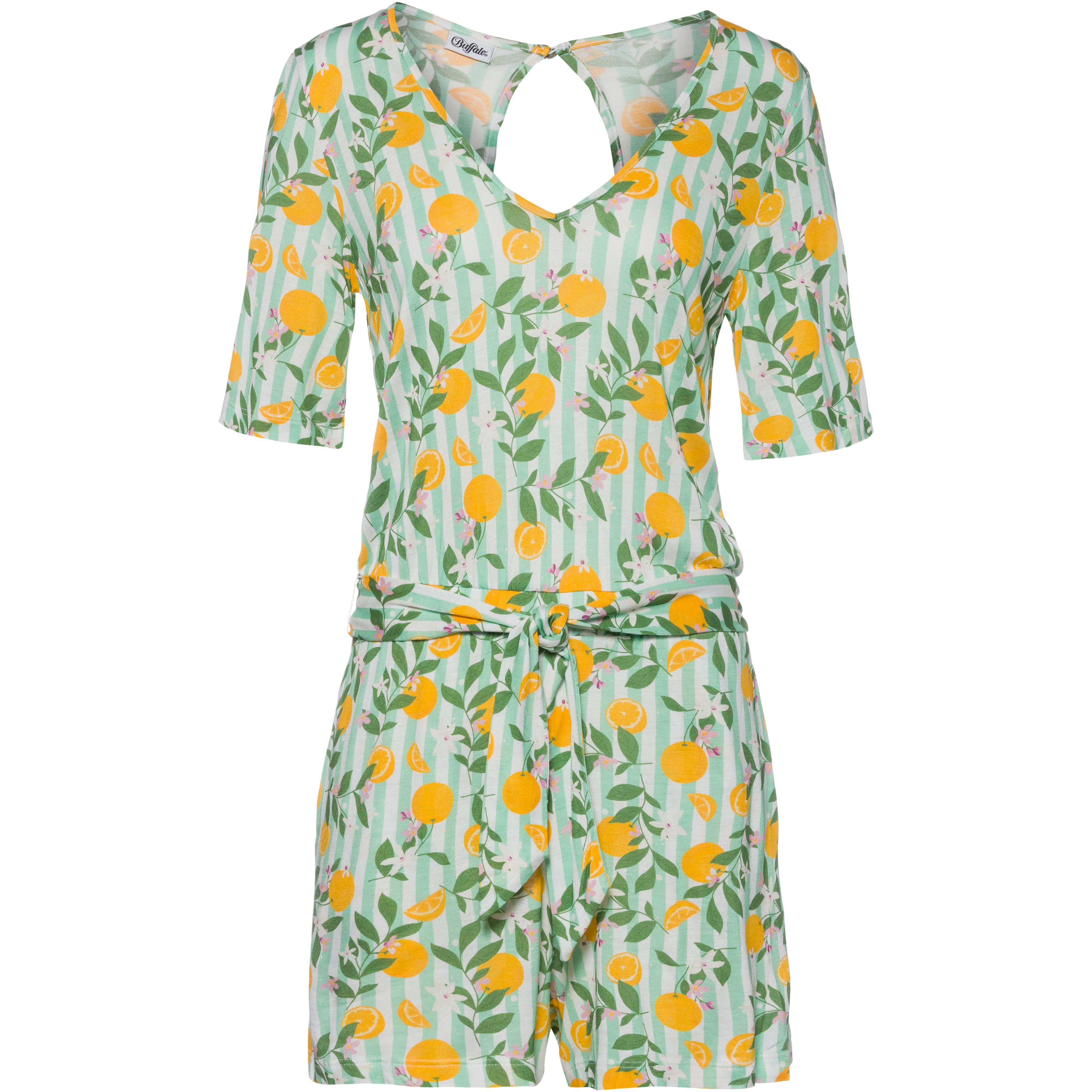 Kurzer Overall aus weichem, fließendem Viskosejersey, mit sommerlichem Alloverprint; V-Ausschnitt; tiefer Rückenausschnitt (Länge ca. 40 cm) mit Knopf-und Ösenverschluss im Nackenbereich; Taillierung durch Gummibund und breitem Bindegürtel; 2 seitliche Eingriffstaschen; Recyclingmaterial; Material 100% Viskose.