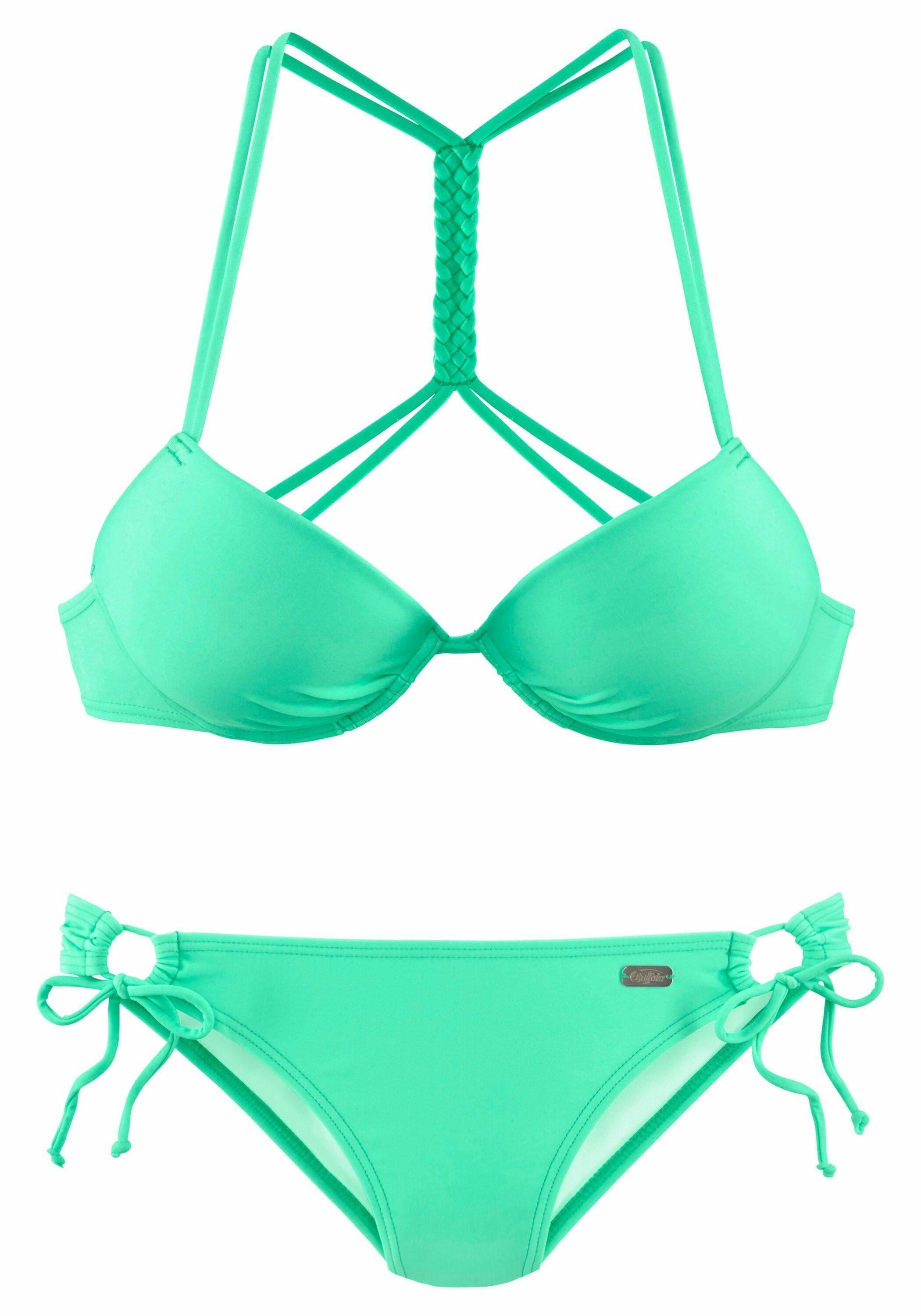 Mit wattierten Cups und eingearbeiteter Verstärkung für einen tollen Push-up Effekt. Trendige Rückenansicht mit modischen Straps- und Flechdetails. Doppelträger. Top im Rücken zu binden, Hose seitlich zu binden.