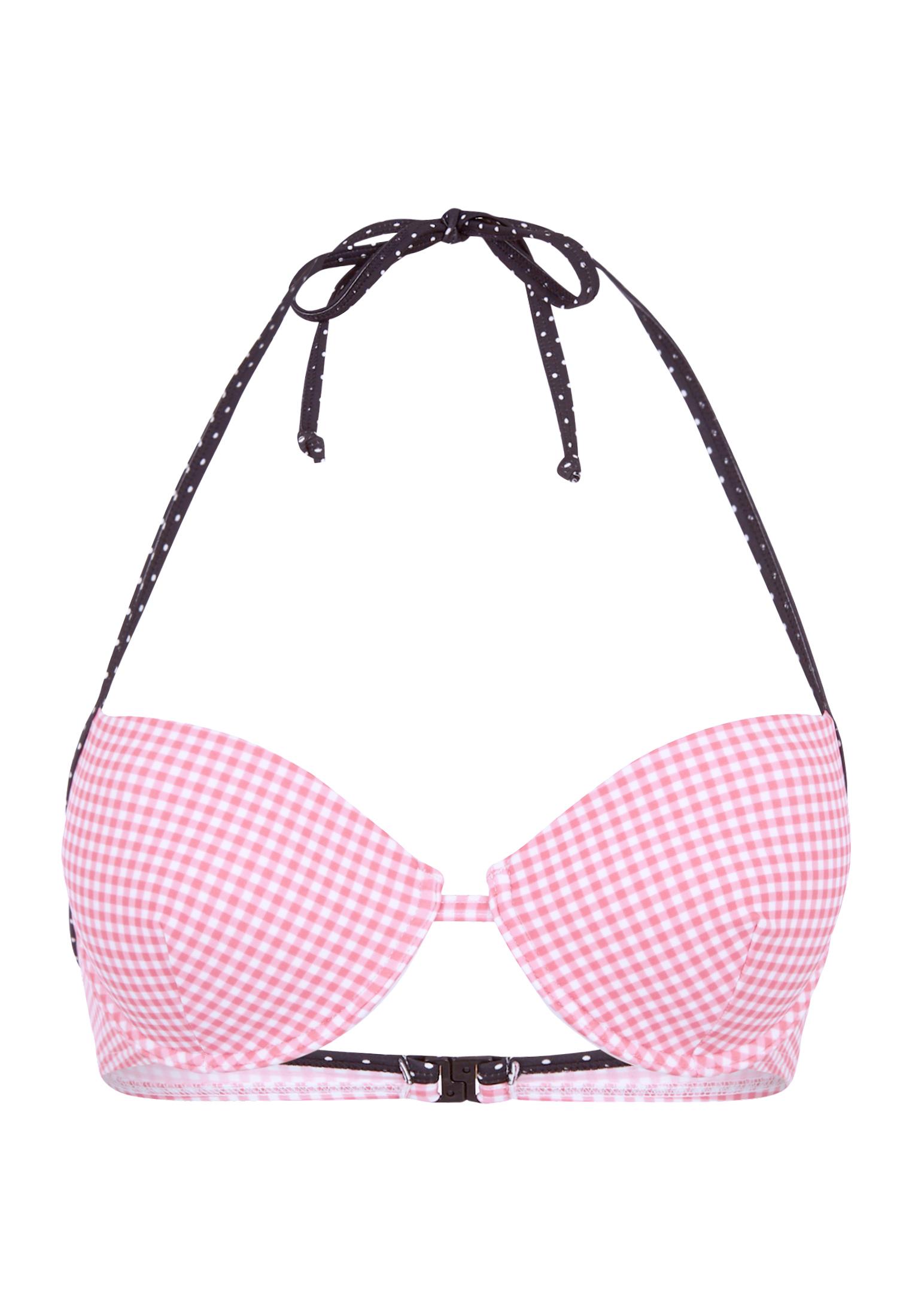 Mit wattierten Cups und herausnehmbaren Kissen für ein sexy Dekolleté. In Neckholder-Form, im Nacken zu binden und im Rücken zu schließen. Im coolen Mix mit Vichykaros und Punktedessin. Aus 80% Polyamid, 20% Elasthan (LYCRA®). Futter: 100% Polyester. Mix Dir Deinen Lieblings-Bikini! Bikini-Top und Bikini-Hose sind getrennt bestellfähig und können somit optimal miteinander kombinieret werden. Der besondere Look aus Pünktchen-Dessin und Vichy-Karos verleiht dem Push-up-Top einen Hauch von Raffiniesse. Die wattierten Cups sorgen für ein tolles Dekolleté. Das Push-up-Top ist ideal für kleine Größen und auch im Cup AA erhältlich. Zusätzlich herausnehmbare Kissen bringen das Dekolleté gut zur Geltung. Mit diesem Bikini-Top ist ein heißer Sommer garantiert. Die Kult-Marke BUFFALO ist der Trend. Mit ihrem unverkennbaren und unverwechselbaren Style verhilft die Marke seit Jahren Fashionitas in aller Welt zu spektakulären Auftritten, bei denen neidische Blicke garantiert sind. BUFFALO: Lässig & Cool, qualitativ hochwertig, in erstaunlicher Vielfalt, jedoch stets exklusiv. - Marke: Buffalo - Typ: Push-up-Top - Farbe: rosa-schwarz - Stil: Jung & Trendy - Geeignet für: kleinere Cups - Prints/ Applikation: Vichy-Karos und Punkte-Dessin - Cups: wattierte Cups - Padding: mit herausnehmbaren Kissen - Bügel: mit Bügel - Träger: Spaghettiträger - Verschluss: Im Nacken zum Binden - Im Rücken zum Schließen