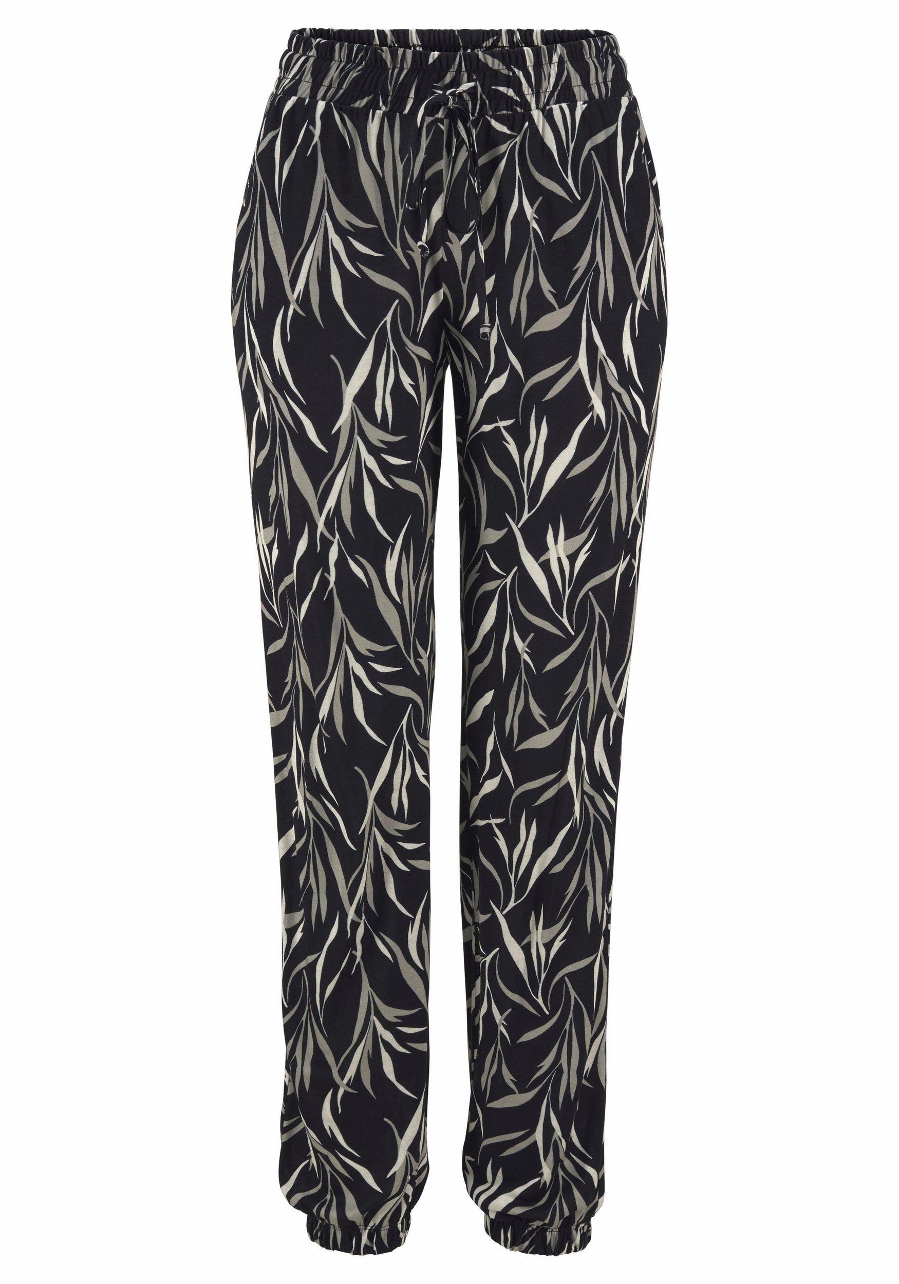 Schlufhose mit Blätterdruck. Breiter Gummizugbund mit Zierkordel. Mit Eingrifftaschen. Gerade Beinform mit Gummizug am Saum. Allover bedruckt, jedes Teil ein Unikat. Aus Viskose.