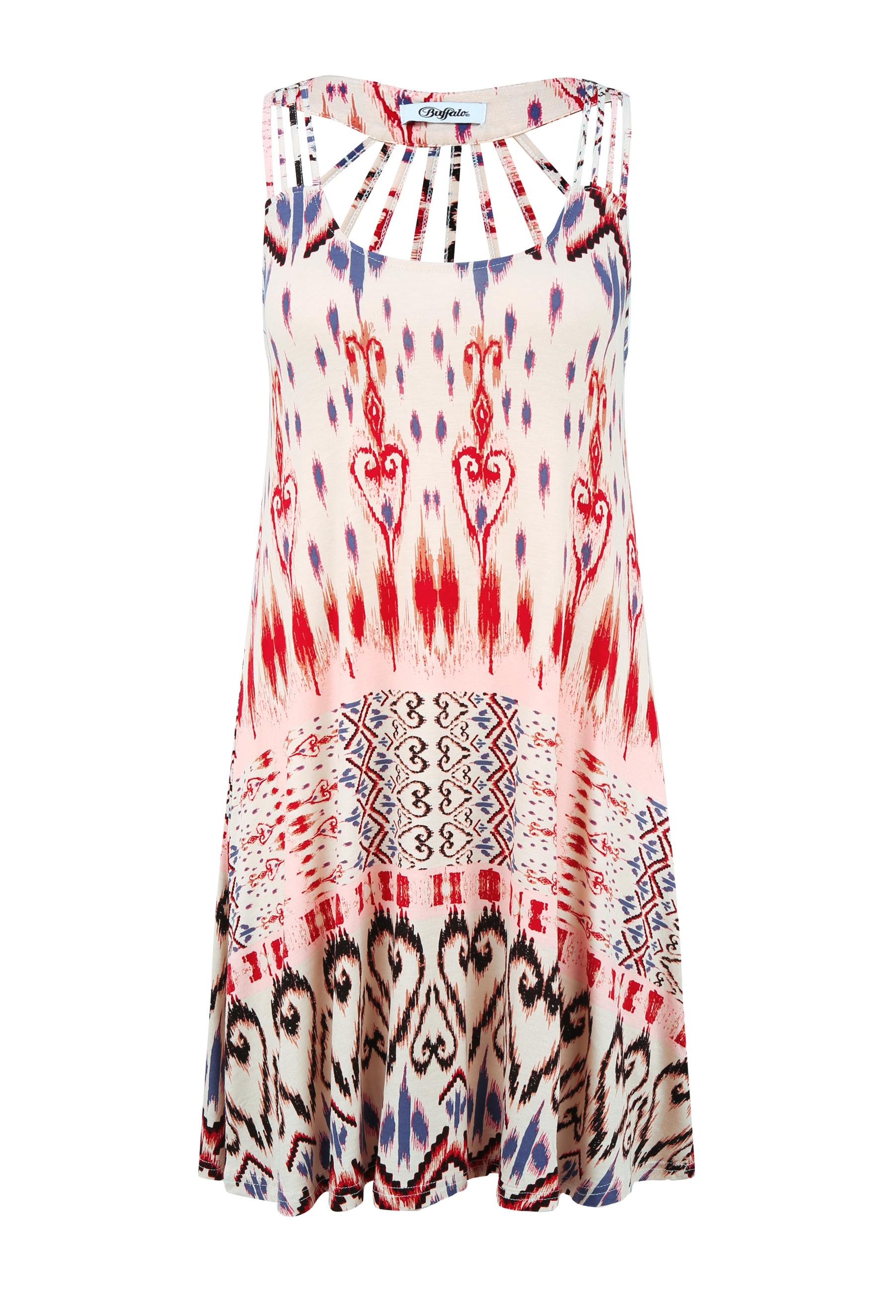 Kleid von Buffalo. Tief ausgeschnitten mit je 4 Bändern als Träger auf jeder Seite, im Rücken mit 8 gefächerten Bändern. Länge hintere Mitte ca. 60 cm. Aus Jerseyware.