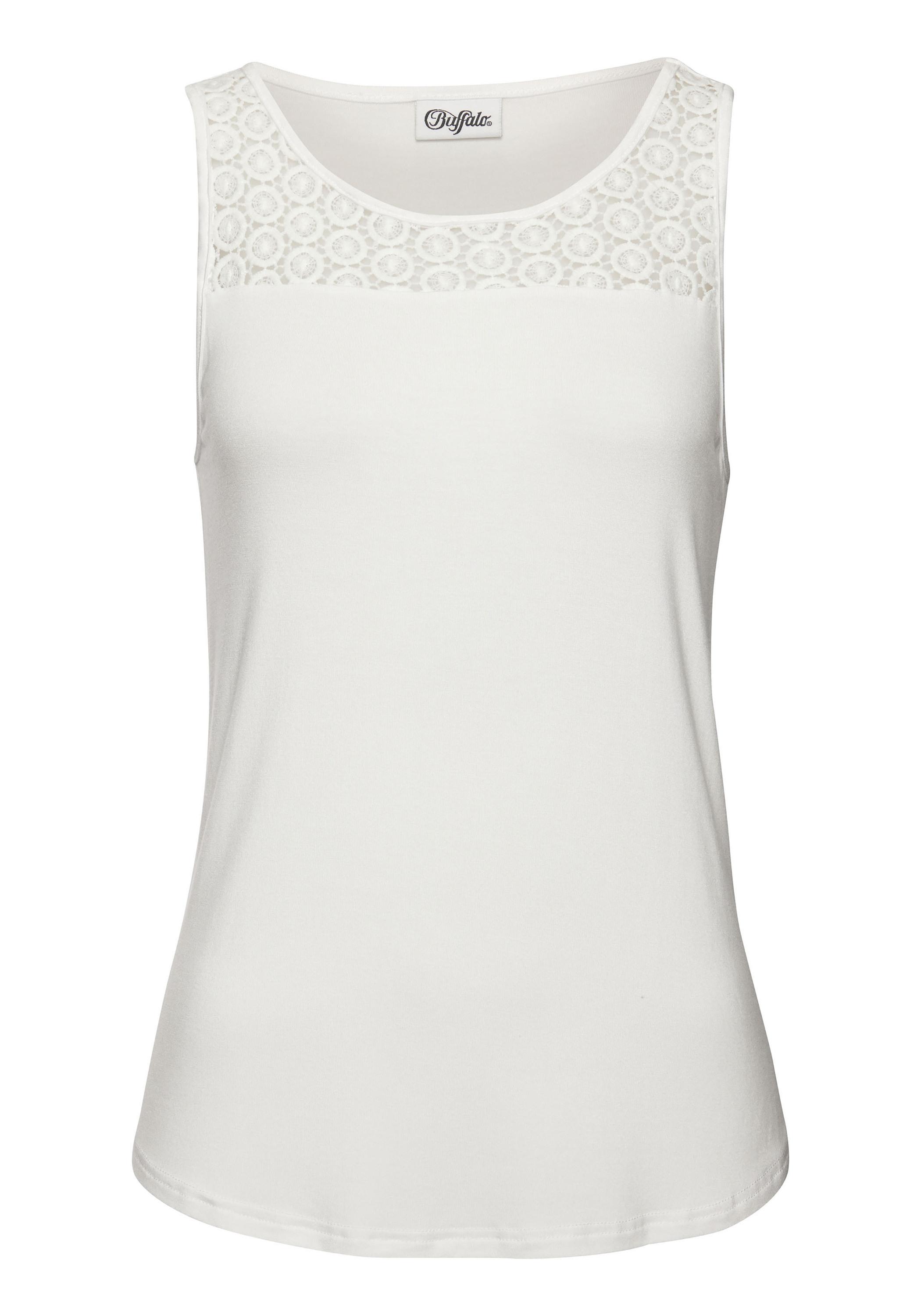 Strandtop von Buffalo mit Häkeleinsatz vorn. Länge ca. 62 cm. Aus 95% Viskose, 5% Elasthan. Häkeleinsatz: 100% Polyester.